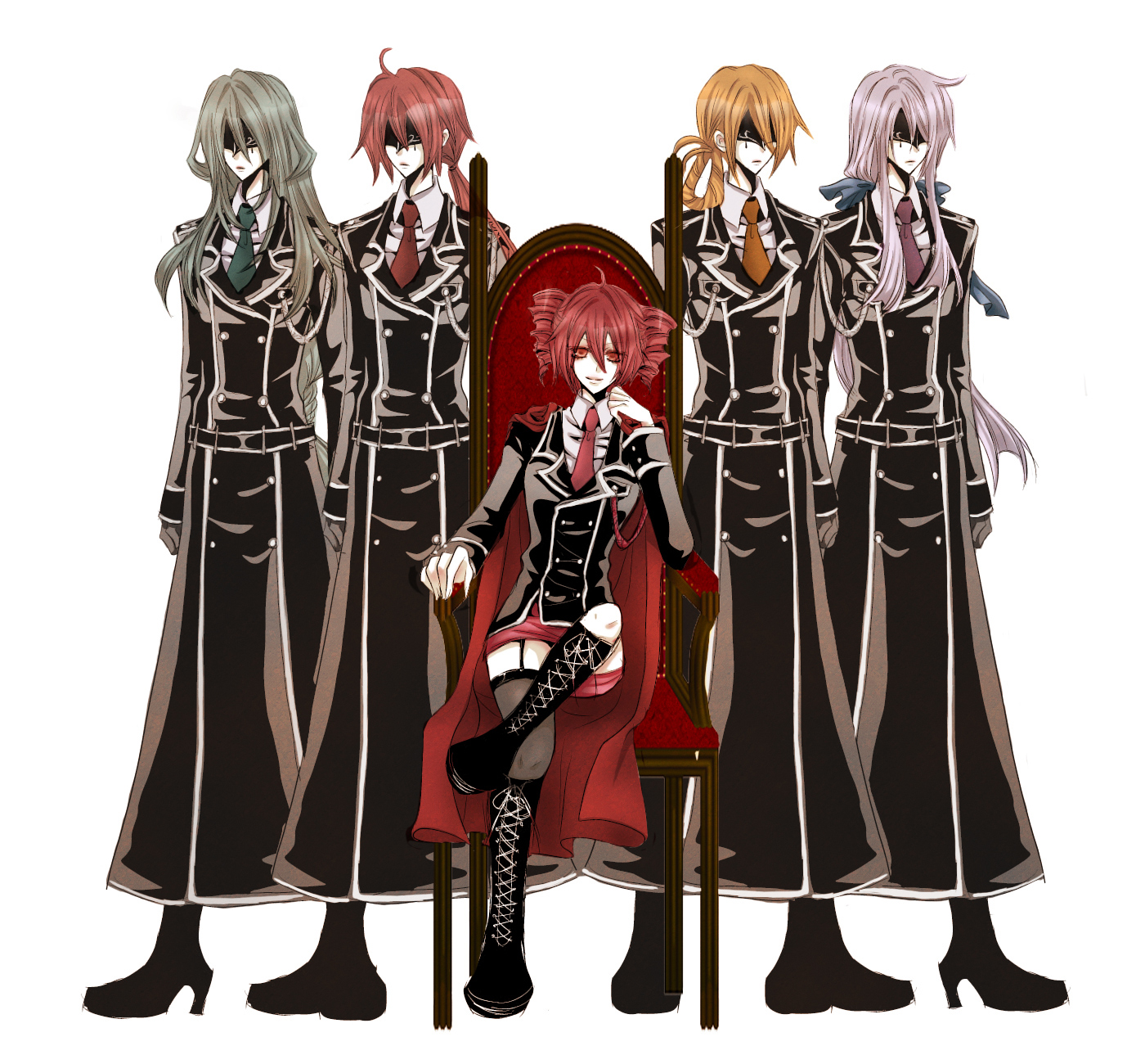 Description: A group of anime characters sitting on a red chair with a white background and a black and white background.