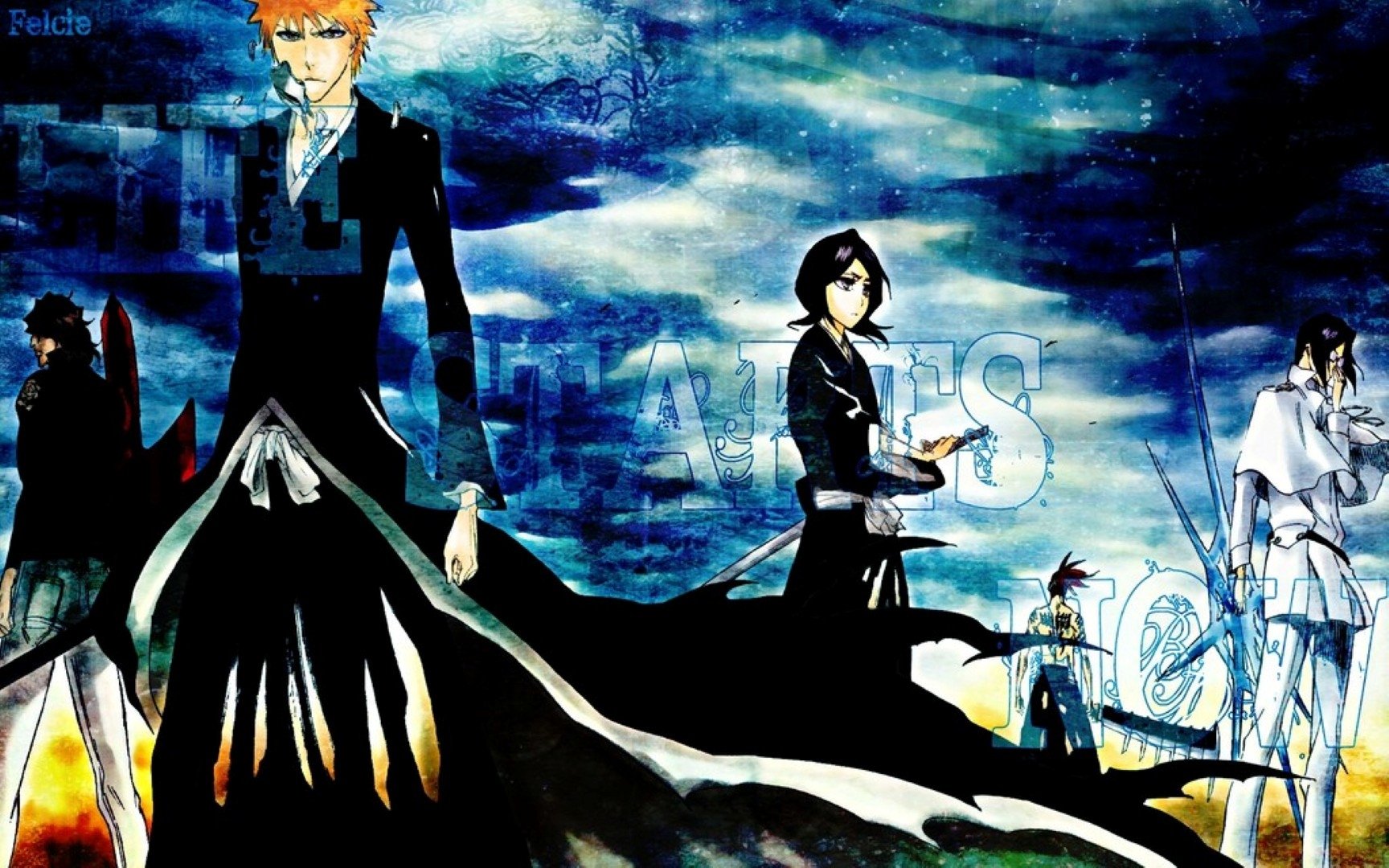 Description: A group of anime characters standing in front of a sky background with clouds and a man in a black suit.