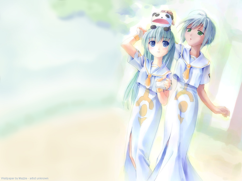 Description: Two anime characters are standing together in a picture with a sky background and clouds in the background.