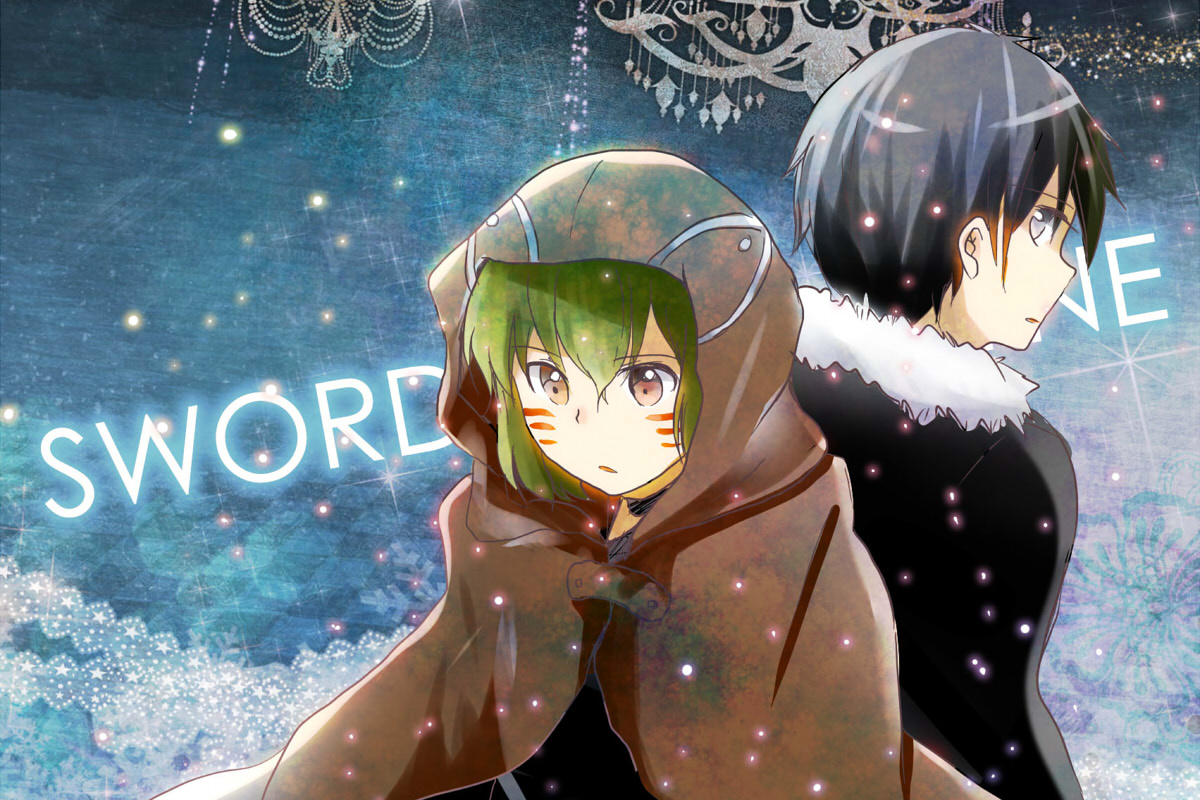 Description: Two anime characters are standing in front of a snowflake background with the words swordflake written in the background.