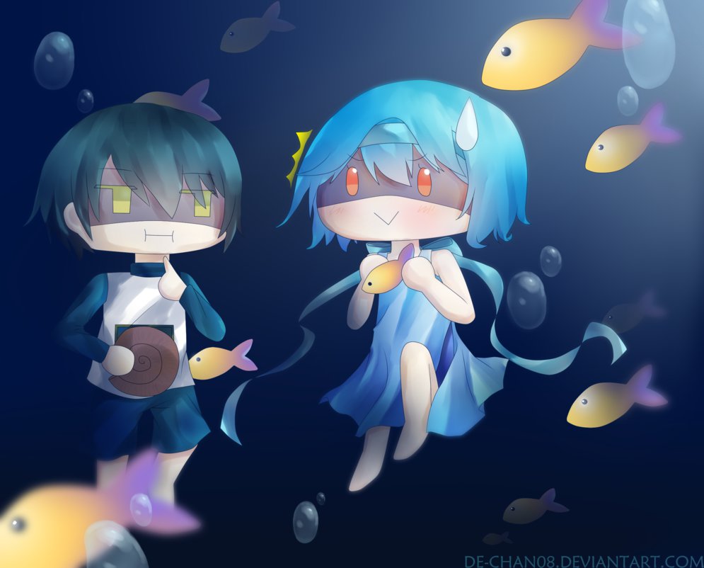 Description: Two anime characters are standing in the water with fish around them and one is holding a fish in his hand.