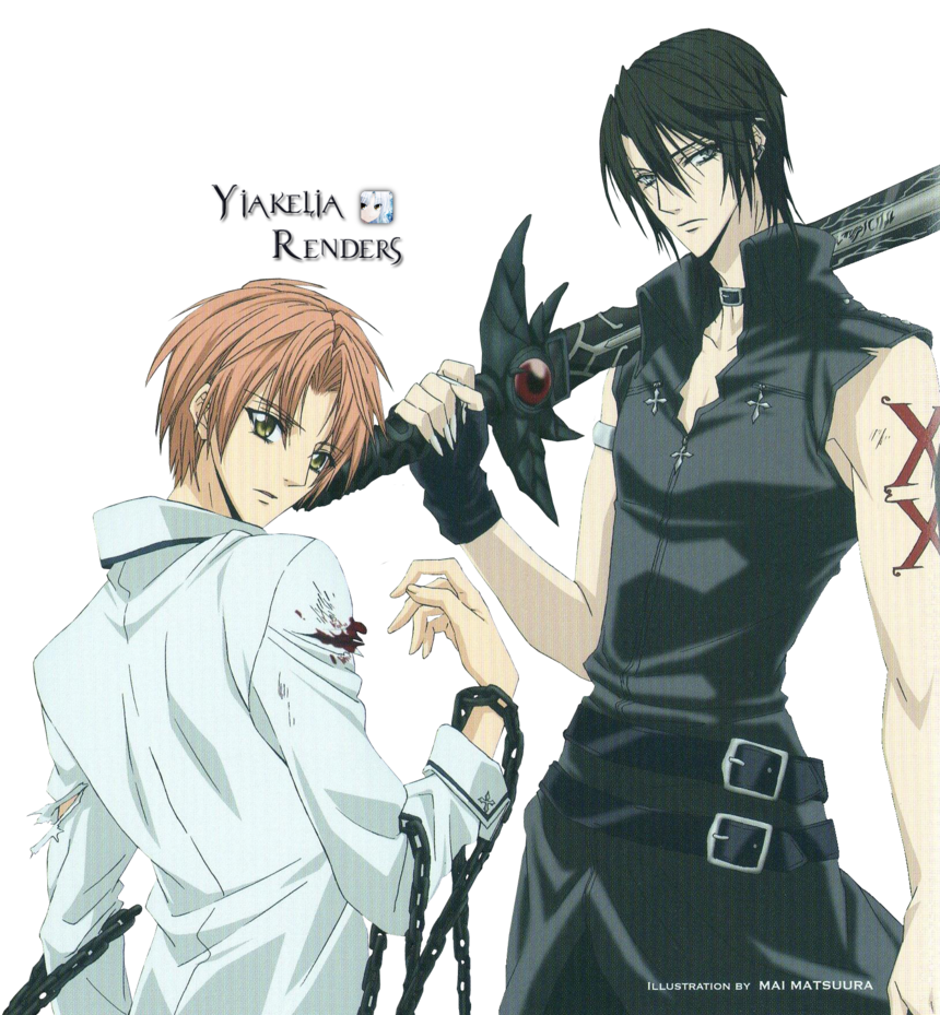 Description: Two anime characters with swords in their hands and one holding a knife in his hand and the other holding a knife in his hand.