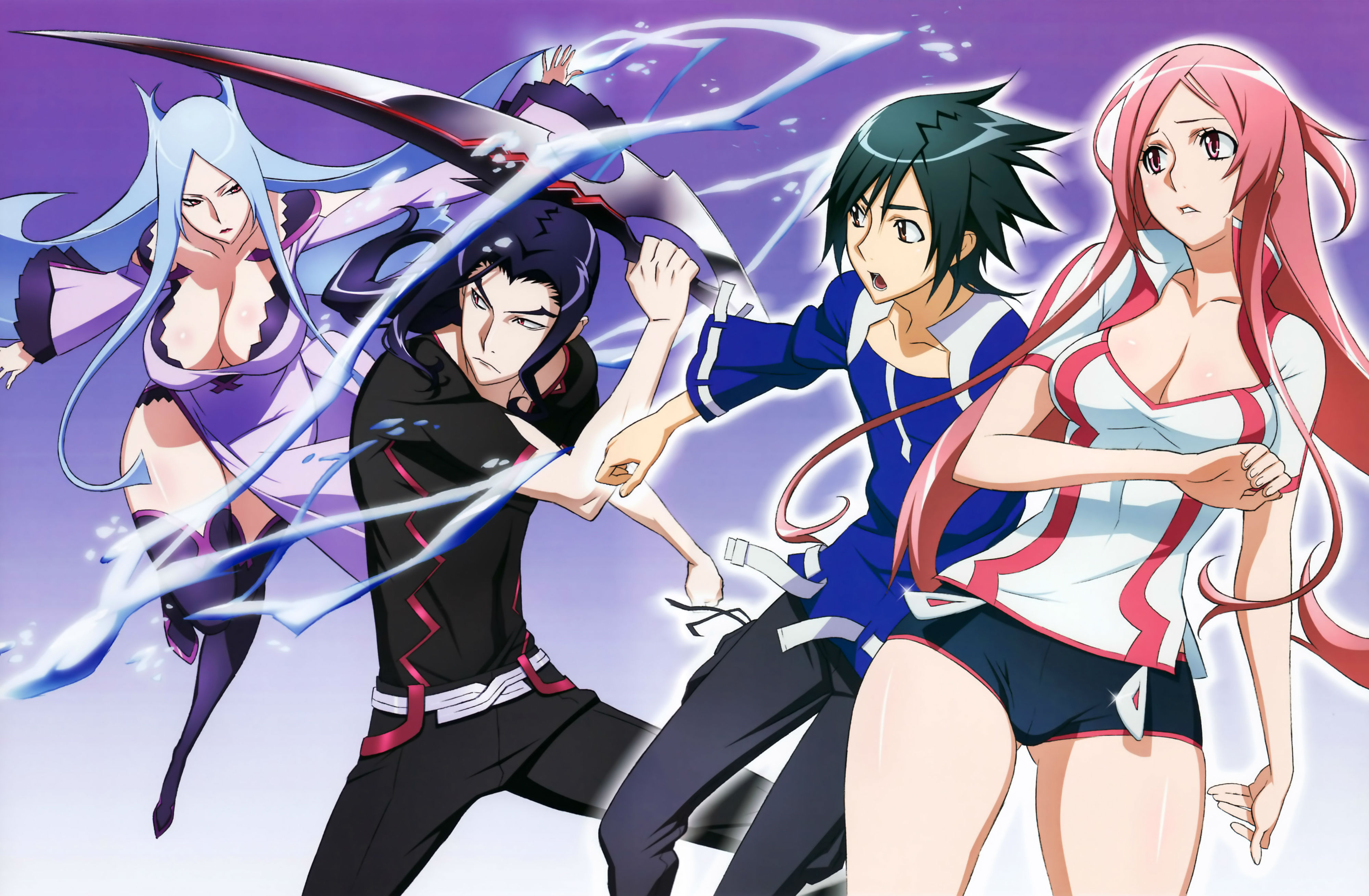 Description: A group of anime characters with swords in their hands and a purple background with a blue sky in the background.
