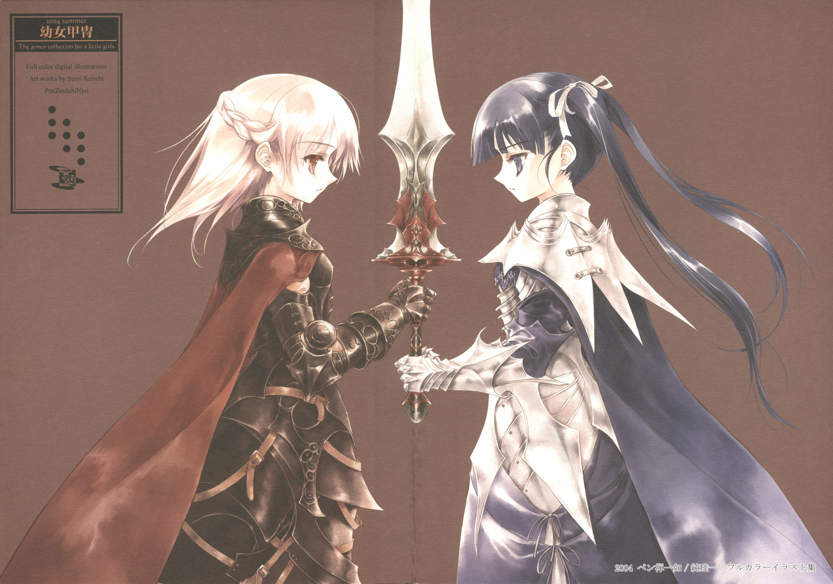 Description: Two anime characters holding swords in their hands and looking at each other with a smile on their face and a smile on their face.
