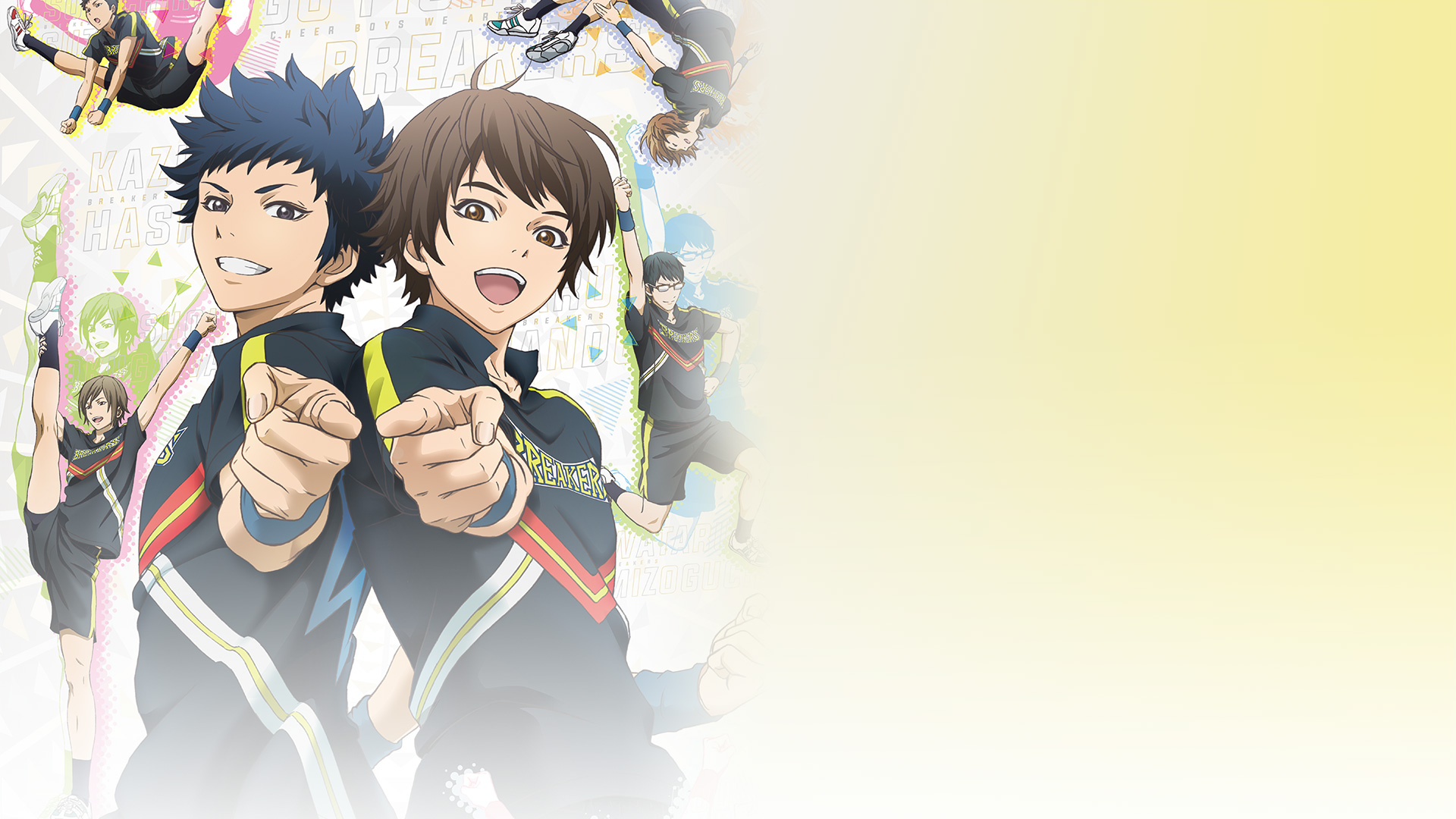 Description: A group of anime characters standing next to each other with their thumbs up in front of them and a yellow background.