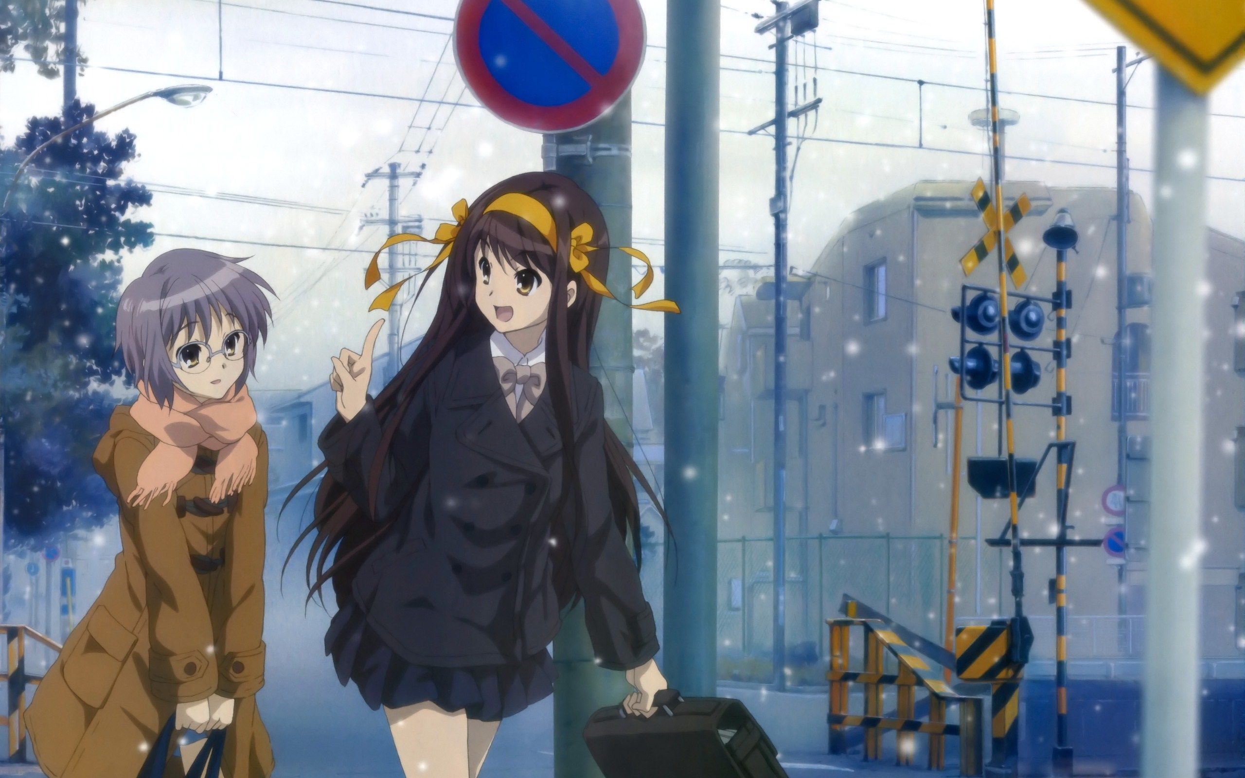 Description: Two anime characters walking down a street with luggage in hand and a traffic sign in the background with snow falling on the ground.