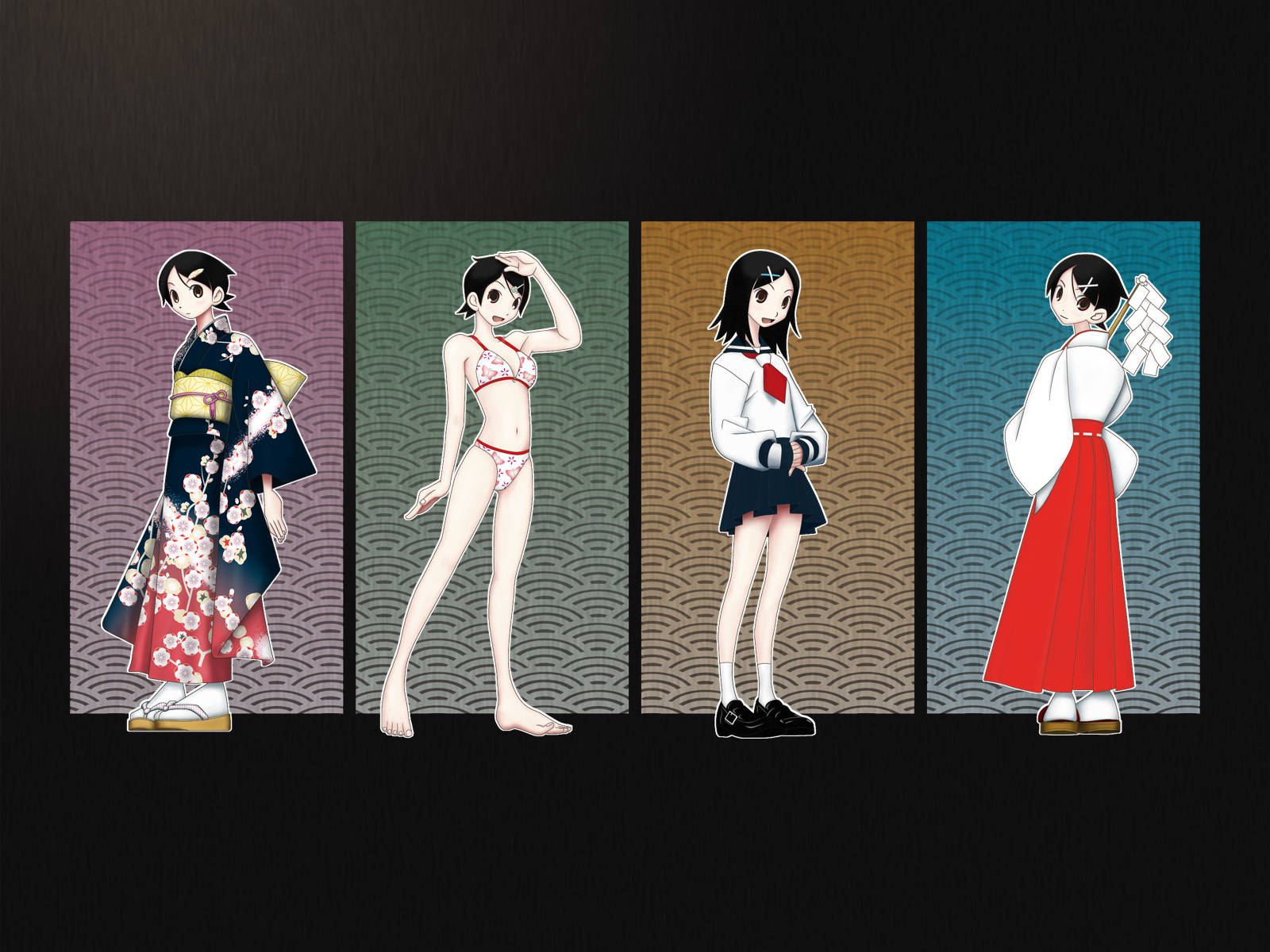 Description: A group of anime characters standing in front of a wall with a black background and four different colors of the same character.
