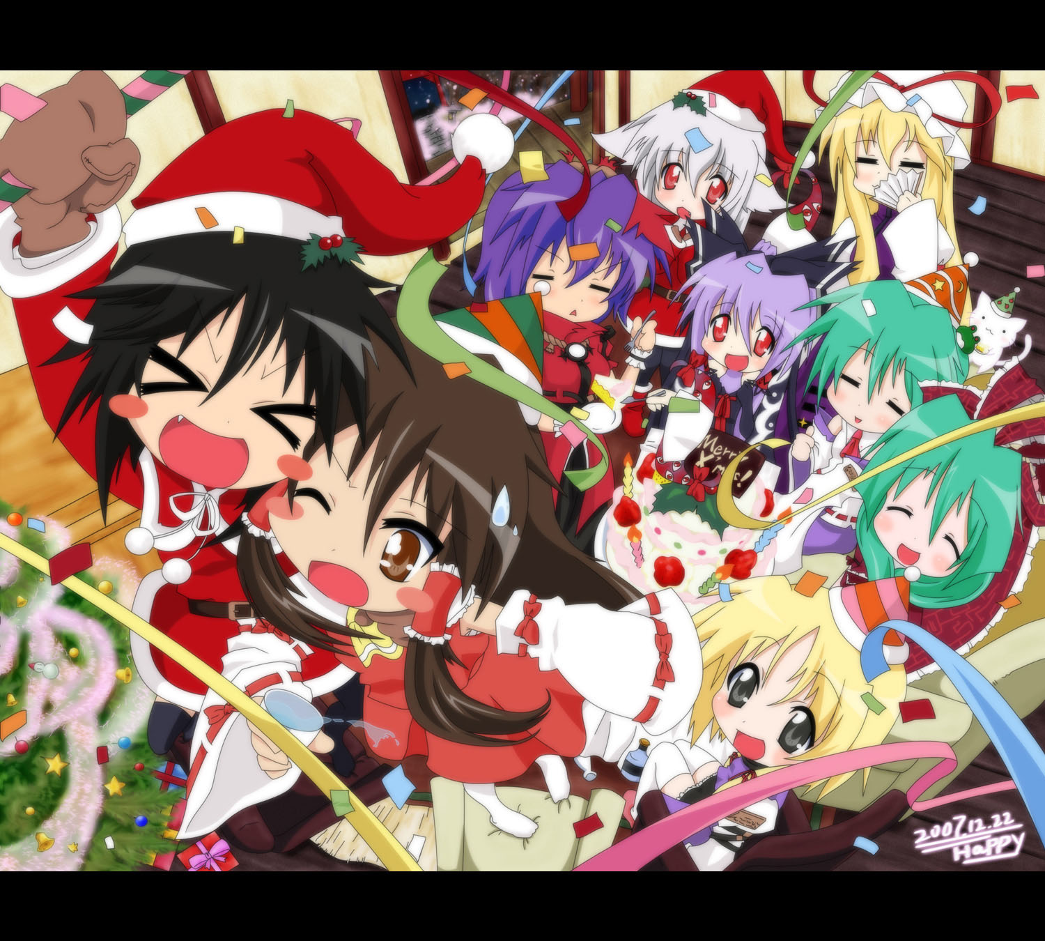 Description: A group of anime characters with christmas decorations in the background and a christmas tree in the foreground with a santa claus hat on.