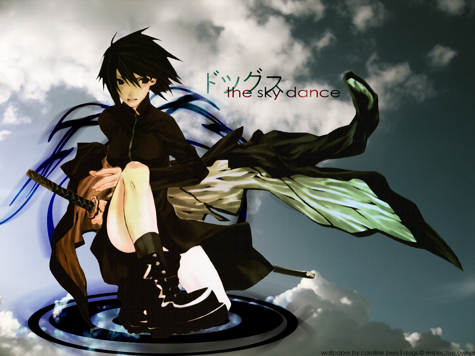 Description: A anime character sitting on a cloud filled sky with a sword in her hand and a demon on her knee.