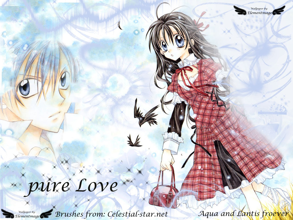 Description: A couple of anime characters with a bird in the background and a blue sky behind them with snowflakes.