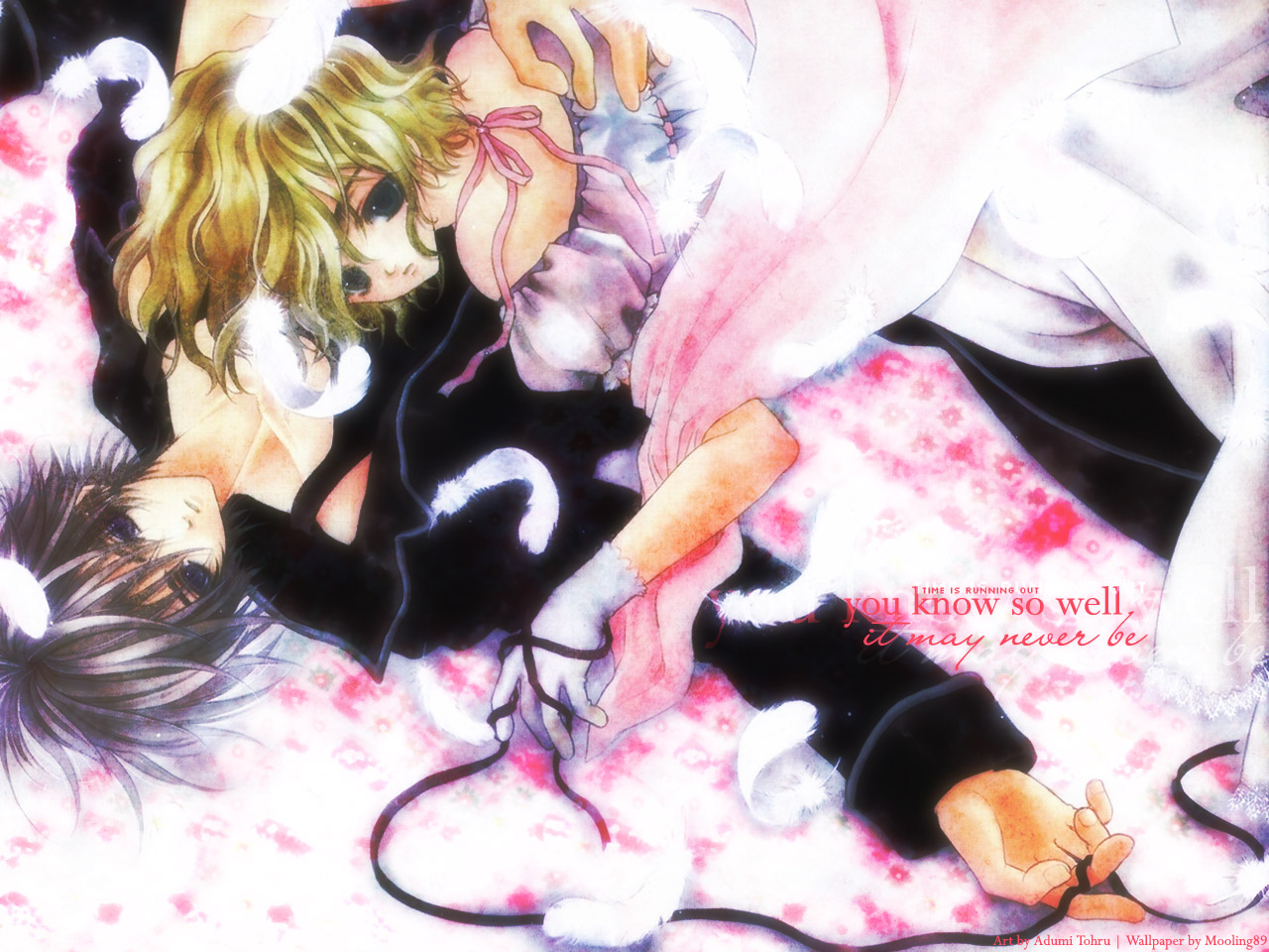 Description: A couple of anime characters laying on a bed together with a caption that reads.