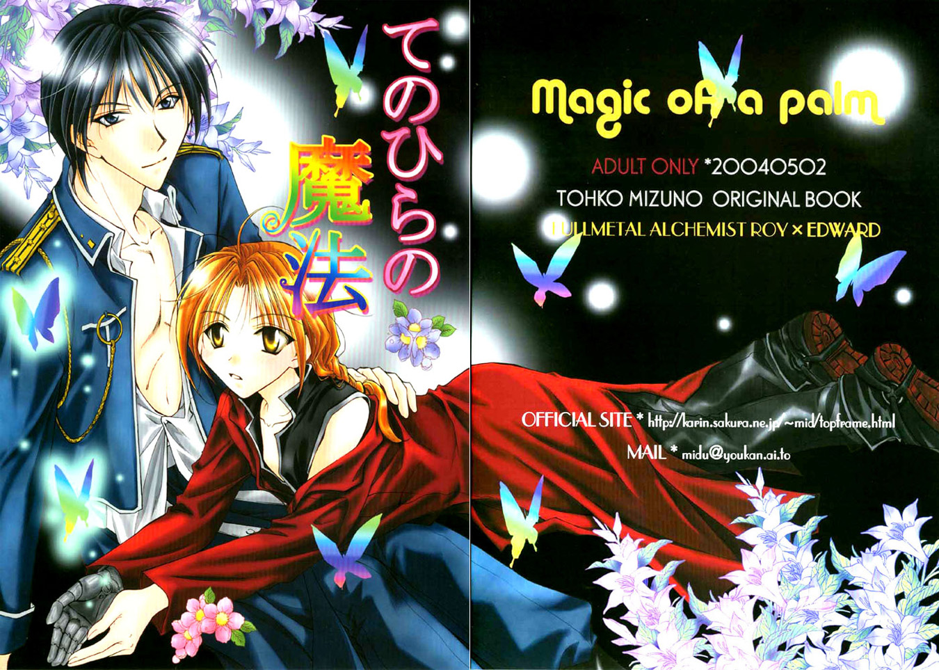 Description: A couple of anime characters laying on top of each other in front of a book cover with butterflies and flowers.