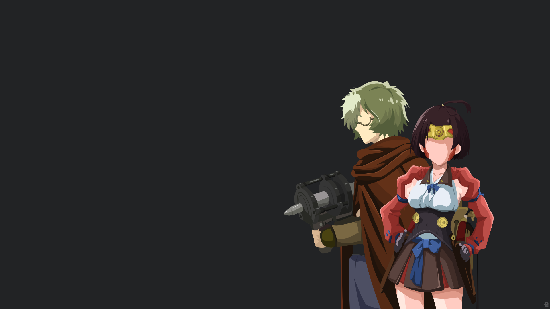 Description: A couple of anime characters standing next to each other in front of a black background with a gun in hand.
