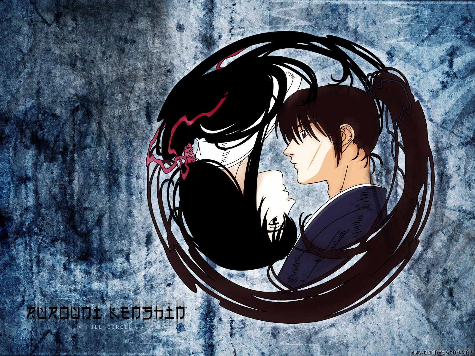 Description: A couple of anime characters with long hair and a demon tail in a circle with a blue background and a text underneath.