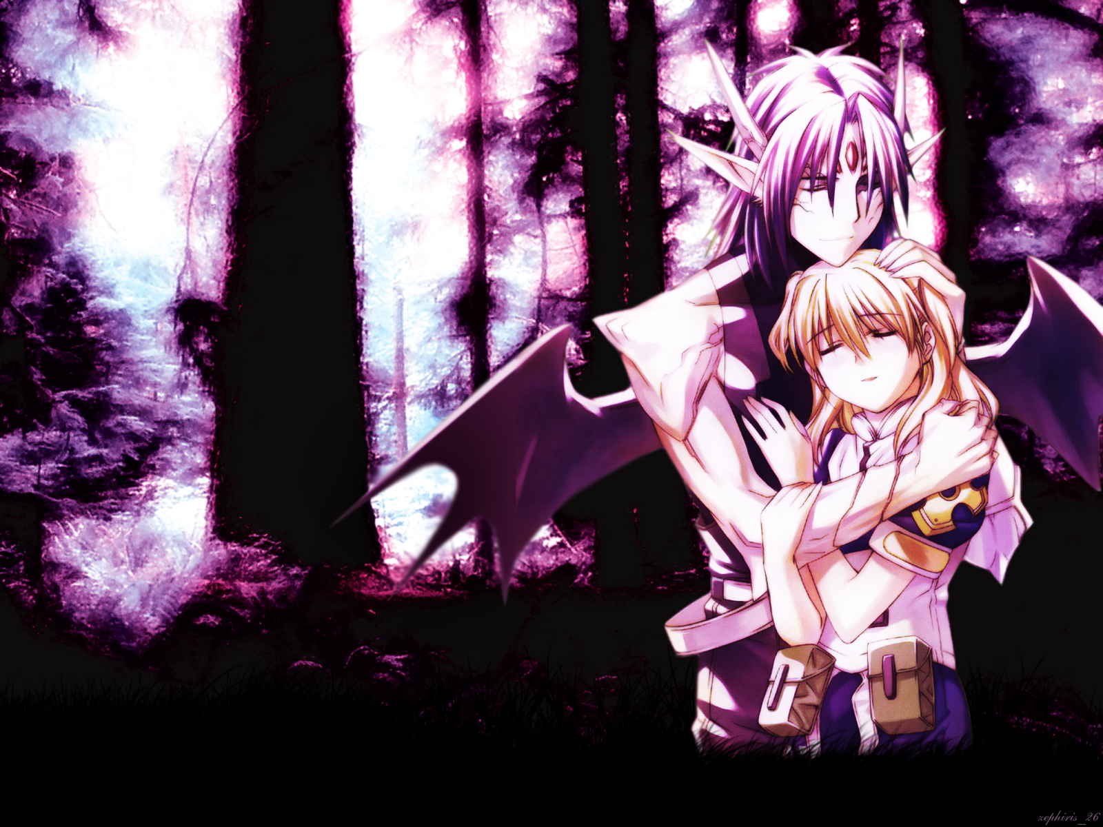 Description: A couple of anime characters standing in the woods together with their arms around each other.