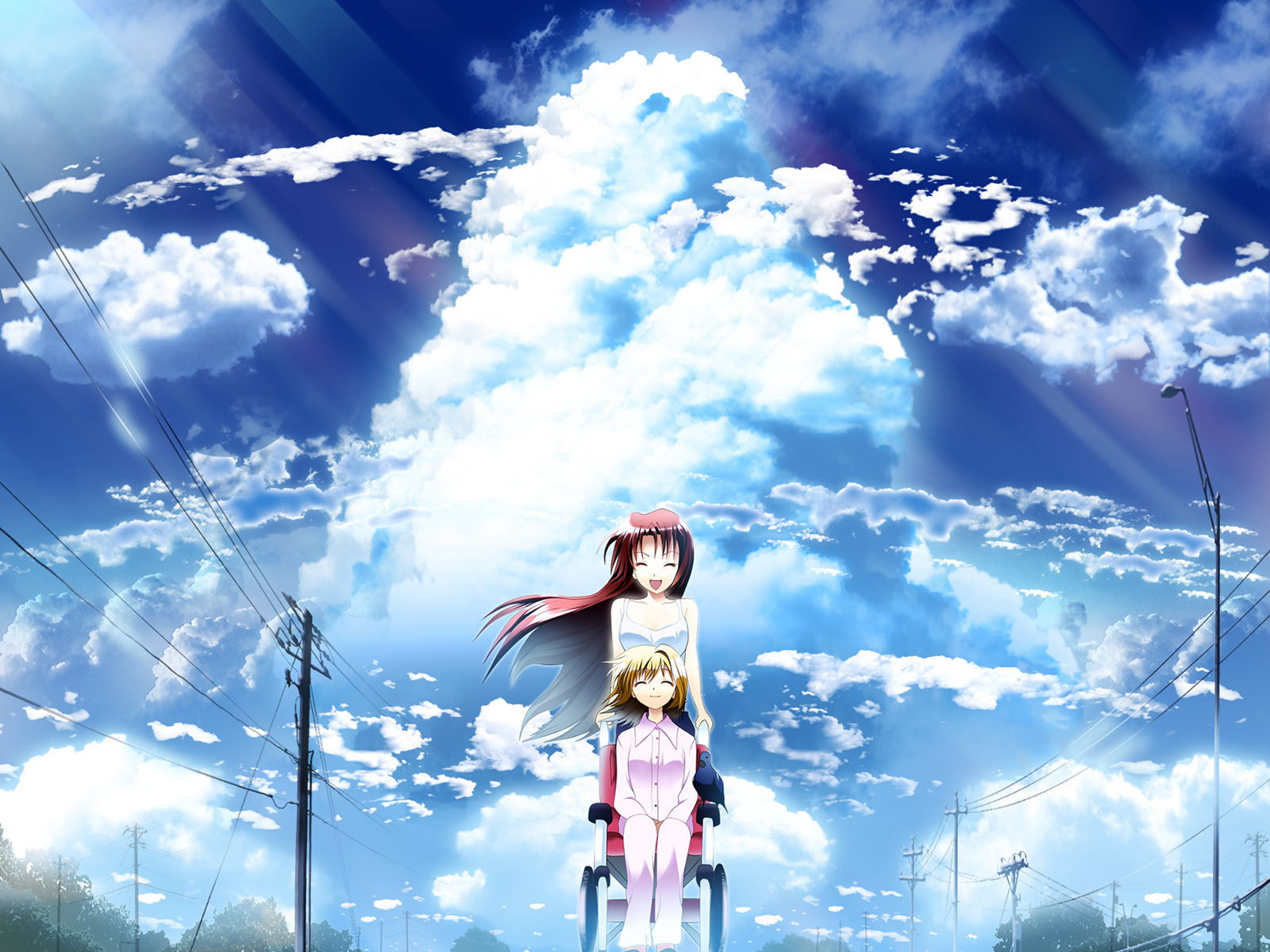 Description: A couple of anime characters standing in the middle of a field with clouds in the background and a blue sky.