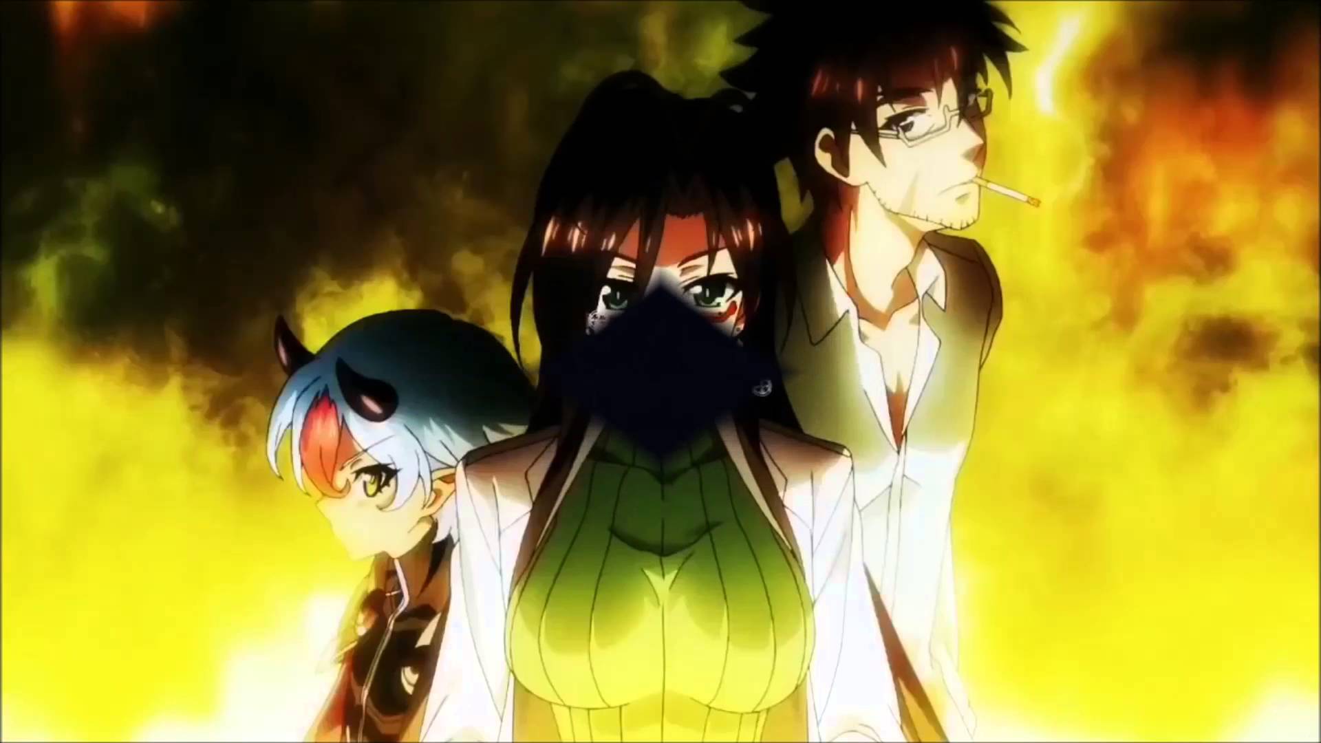 Description: A couple of anime characters standing next to each other in front of a fire background with smoke and flames.