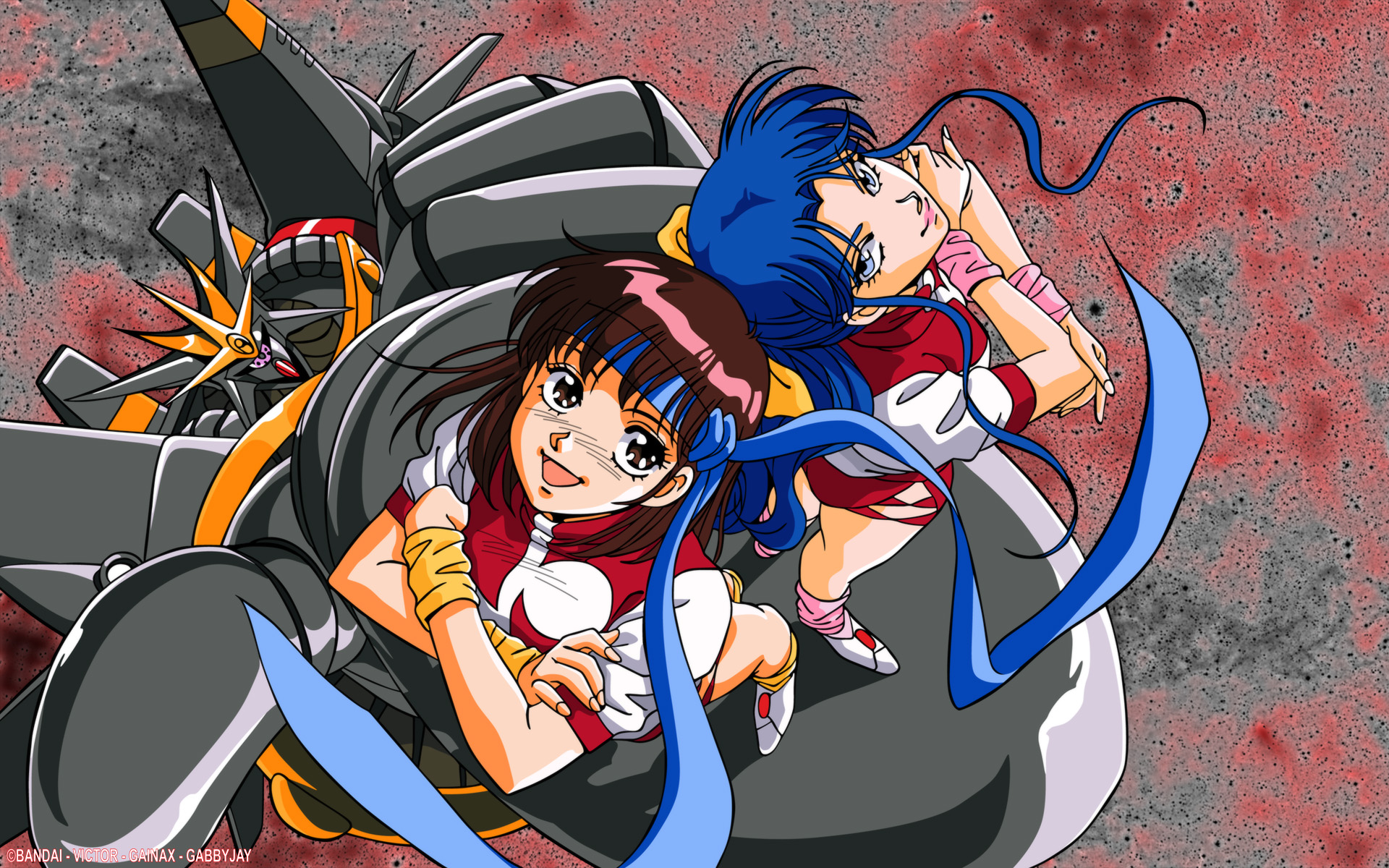 Description: A couple of anime characters are laying on a floor together with a blue ribbon around their necks and a red background.