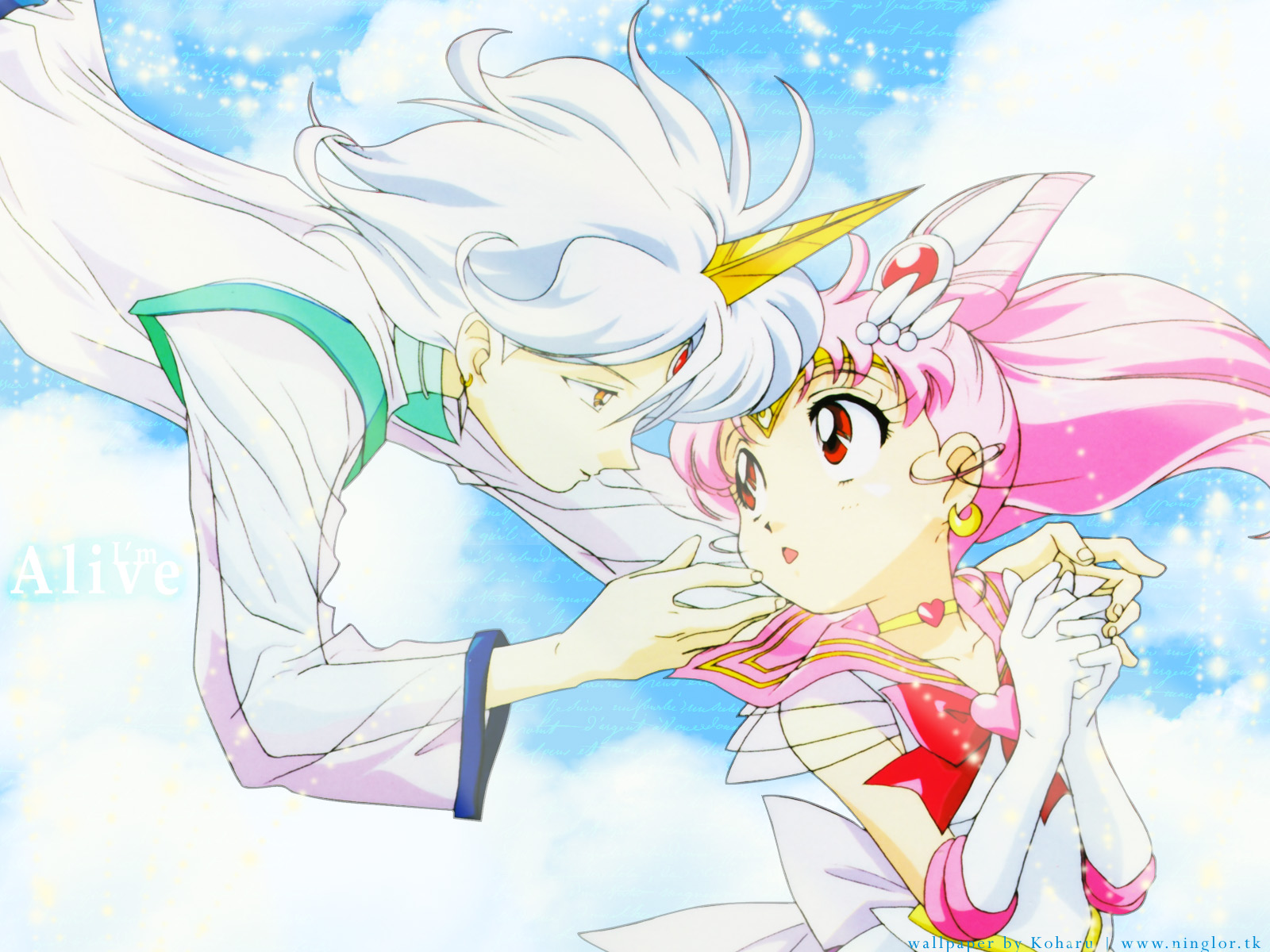 Description: A couple of anime characters are flying through the air together in the sky with clouds and stars behind them.