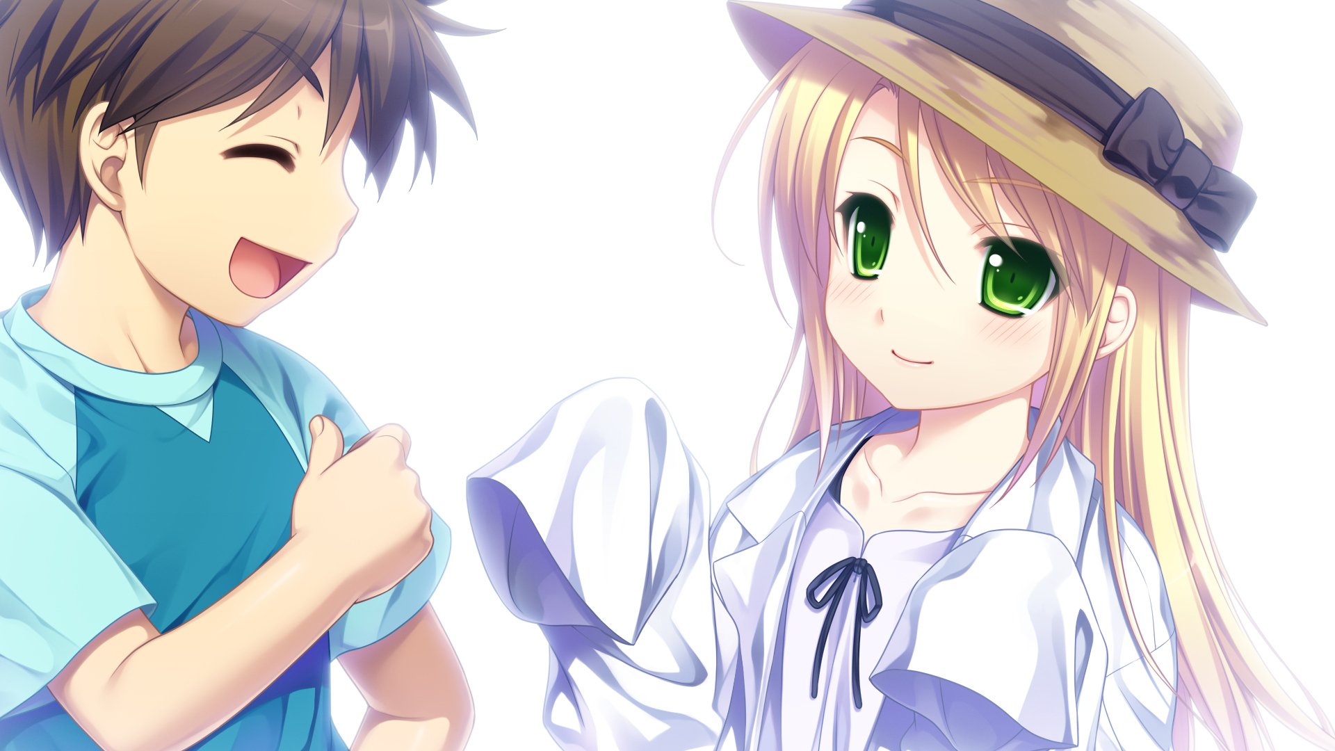 Description: A couple of anime characters with green eyes and a hat on their heads.