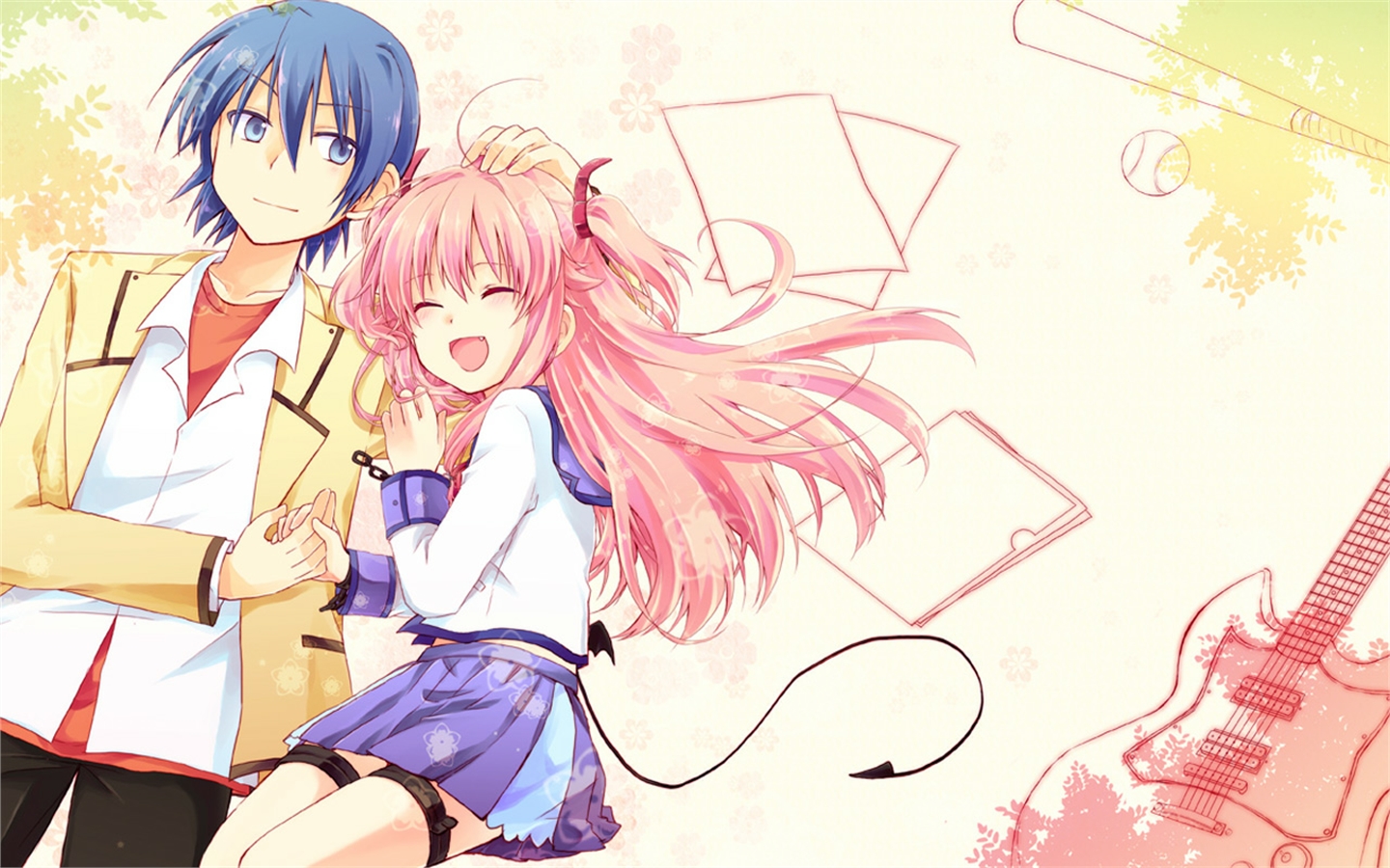 Description: A couple of anime characters standing next to each other with a guitar in the background of the picture and a pink background.