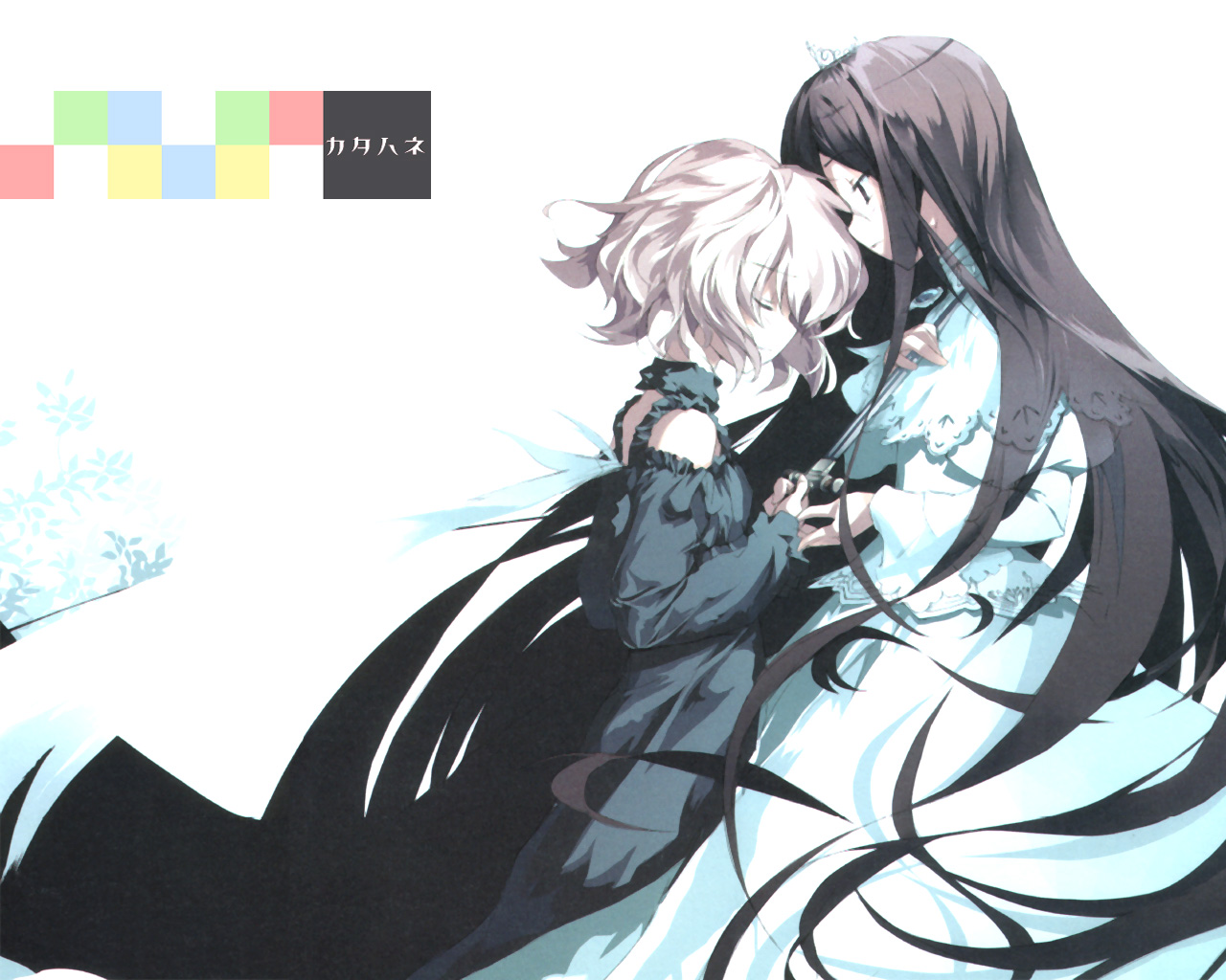 Description: A couple of anime characters hugging each other with a background of color bars in the background and a color bar in the foreground.