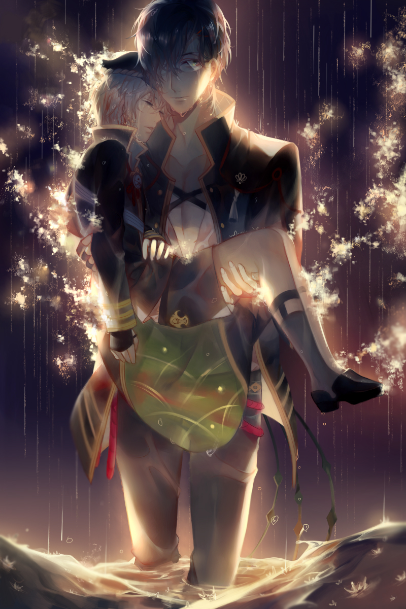 Description: A couple of anime characters hugging in the rain with stars in the background and a dark sky behind them.