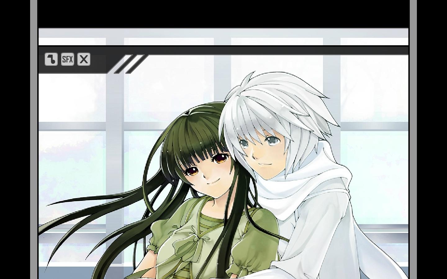 Description: A couple of anime characters hugging each other in a room with windows and a window behind them.