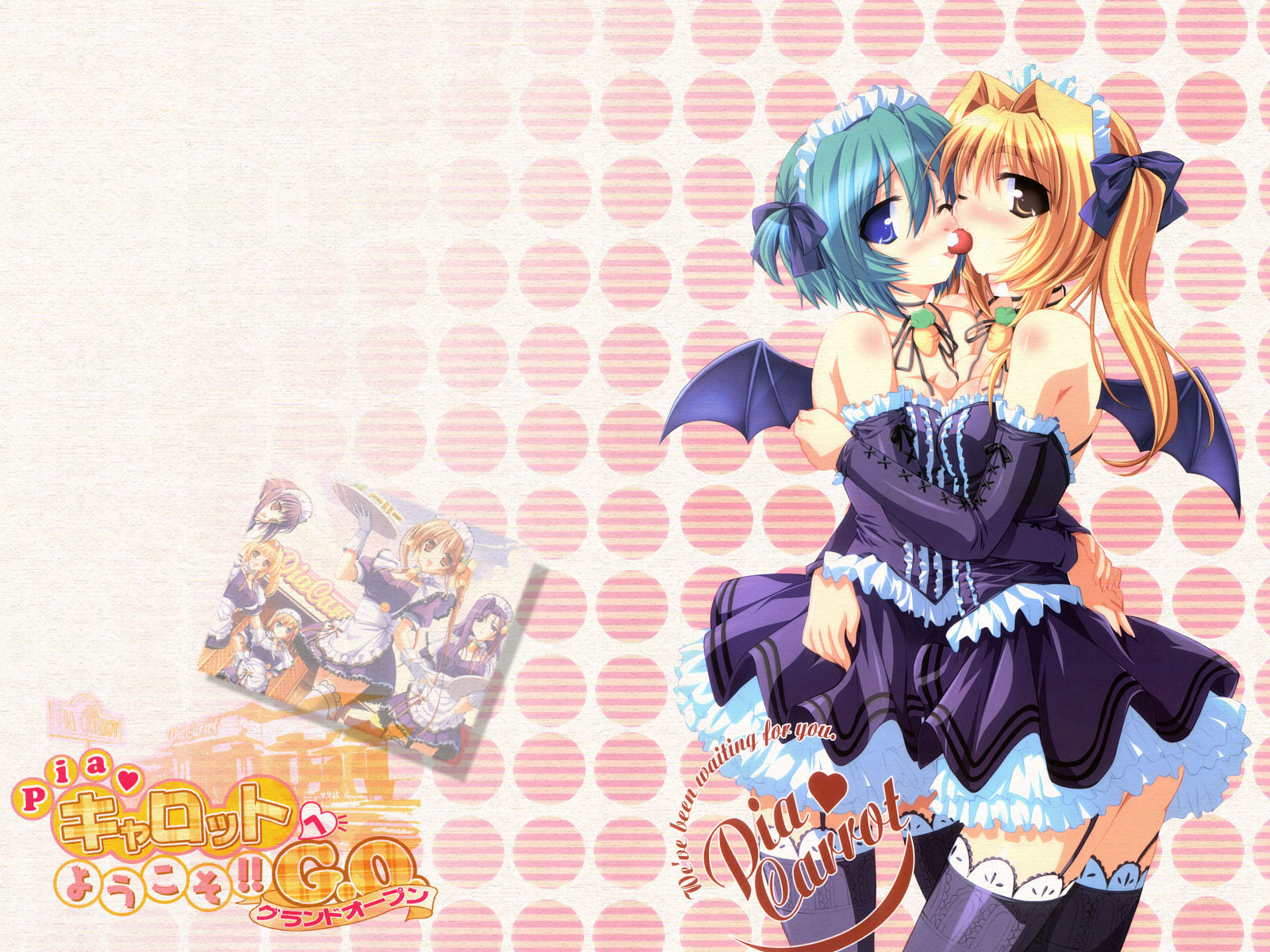 Description: A couple of anime characters kissing each other with a pink background and a pink polka dot background behind them.