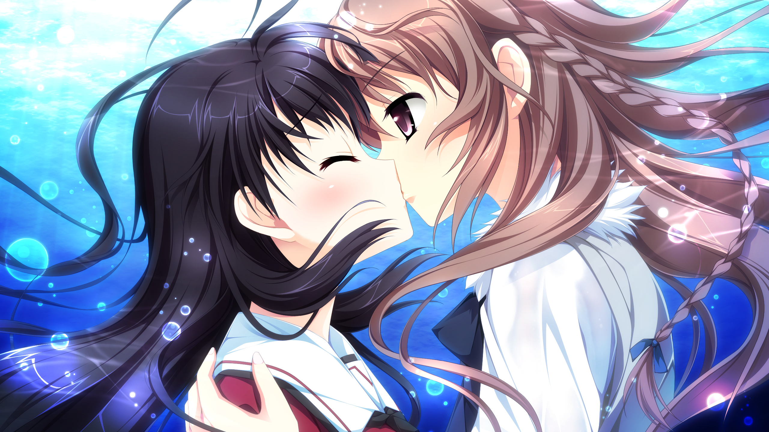 Description: A couple of anime characters kissing in front of a blue background with bubbles and stars in the air and a blue sky.