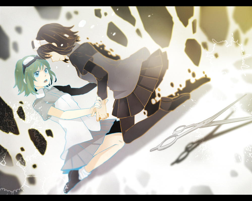 Description: A couple of anime characters are kissing in front of a wall with scissors on it and a black and white background.