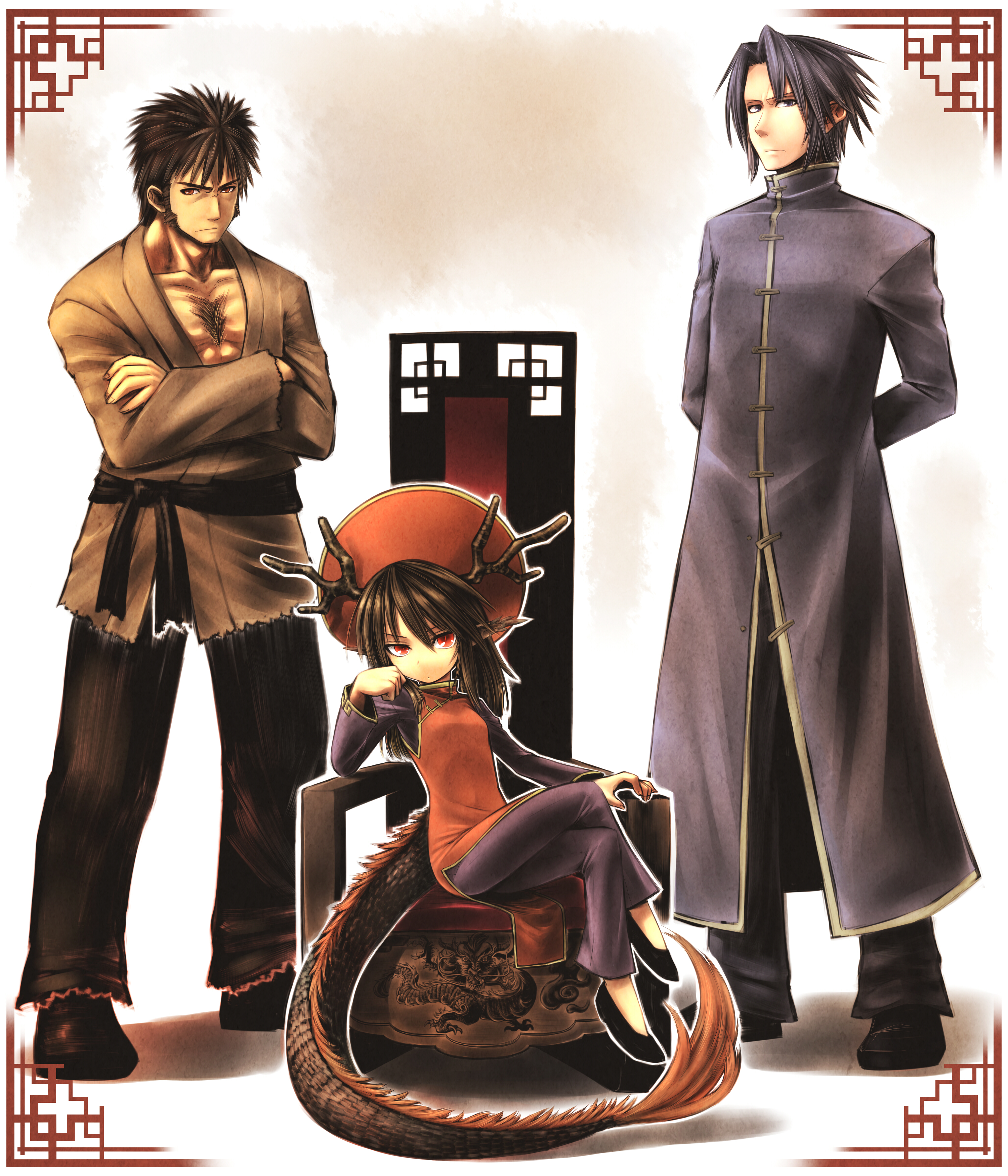 Description: A couple of anime characters standing next to each other in front of a phone booth with a dragon on it.