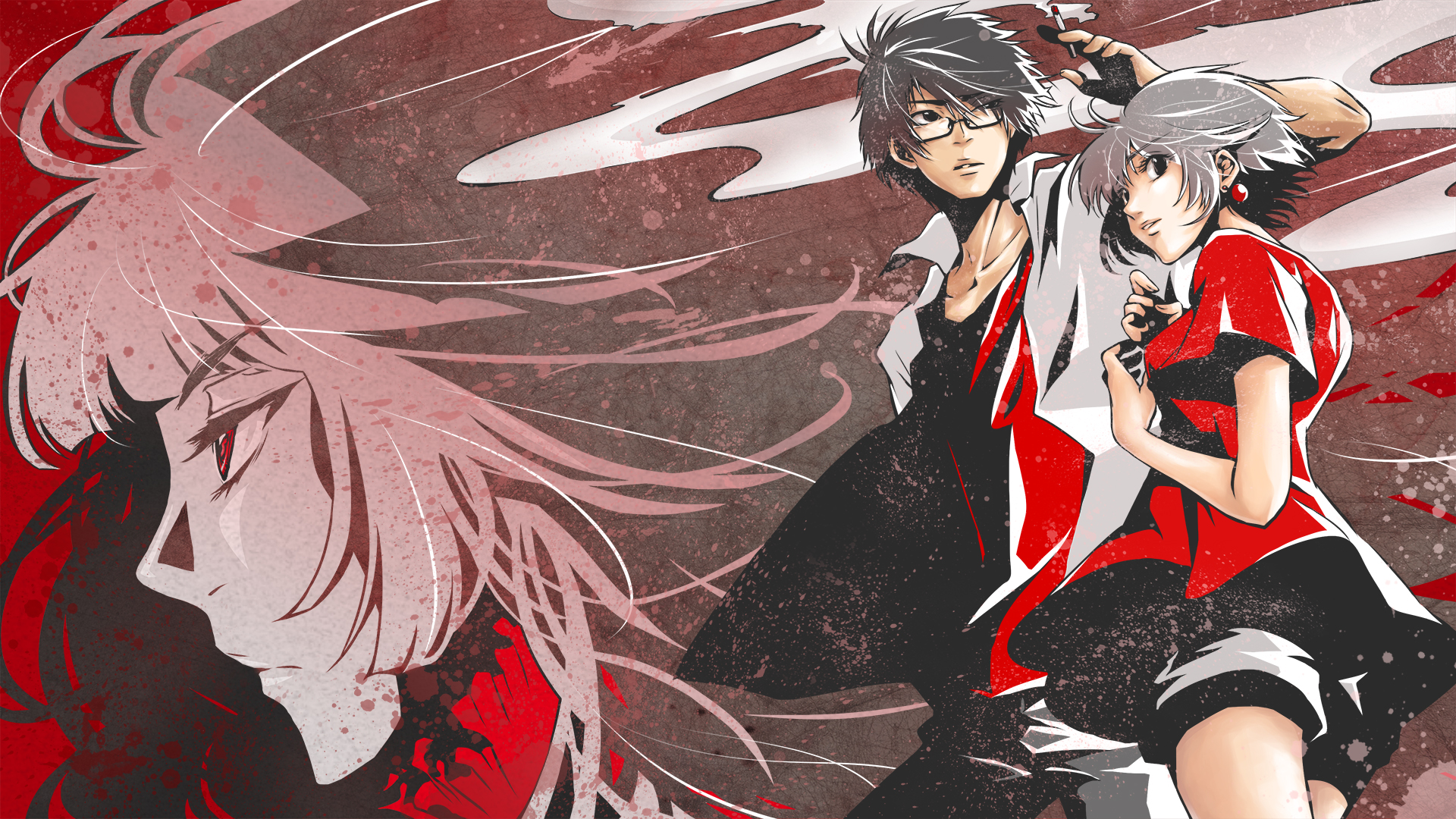 Description: A couple of anime characters standing next to each other on a red background with white wings flying above them.
