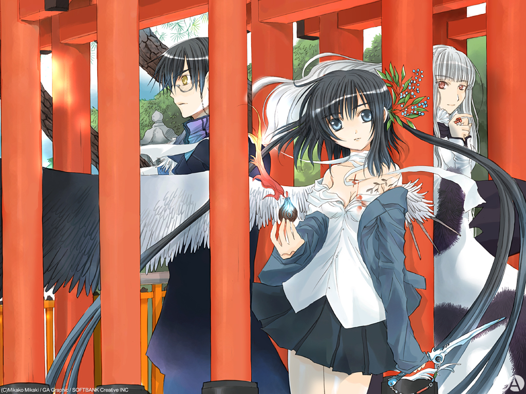 Description: A couple of anime characters standing in front of a red structure with a bird flying over them and a woman holding a bird.