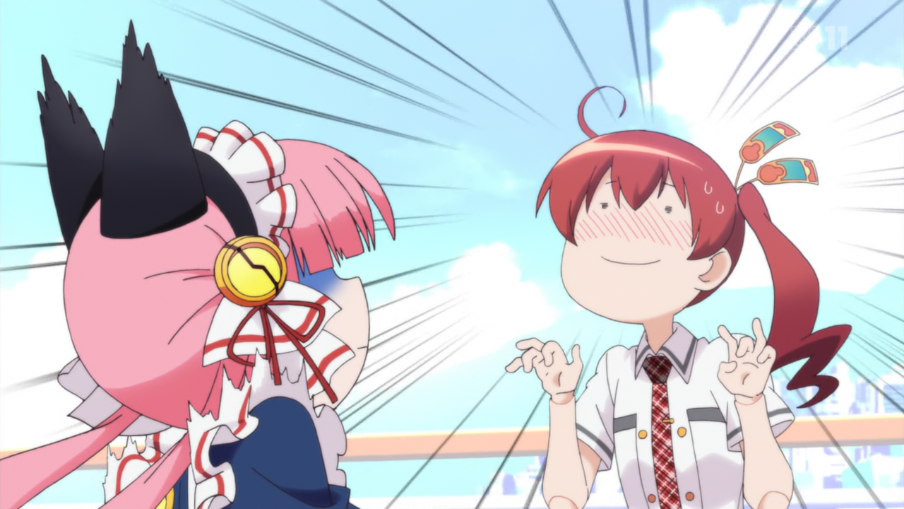 Description: A couple of anime characters standing next to each other in front of a sky background with clouds and sun.