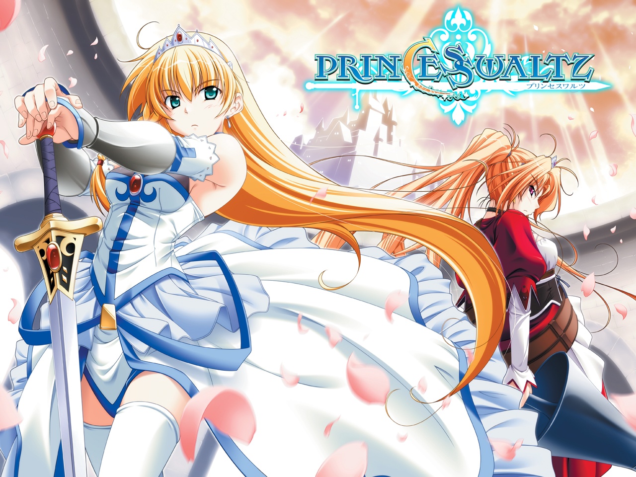 Description: A couple of anime characters standing next to each other in front of a sky background with clouds and stars.