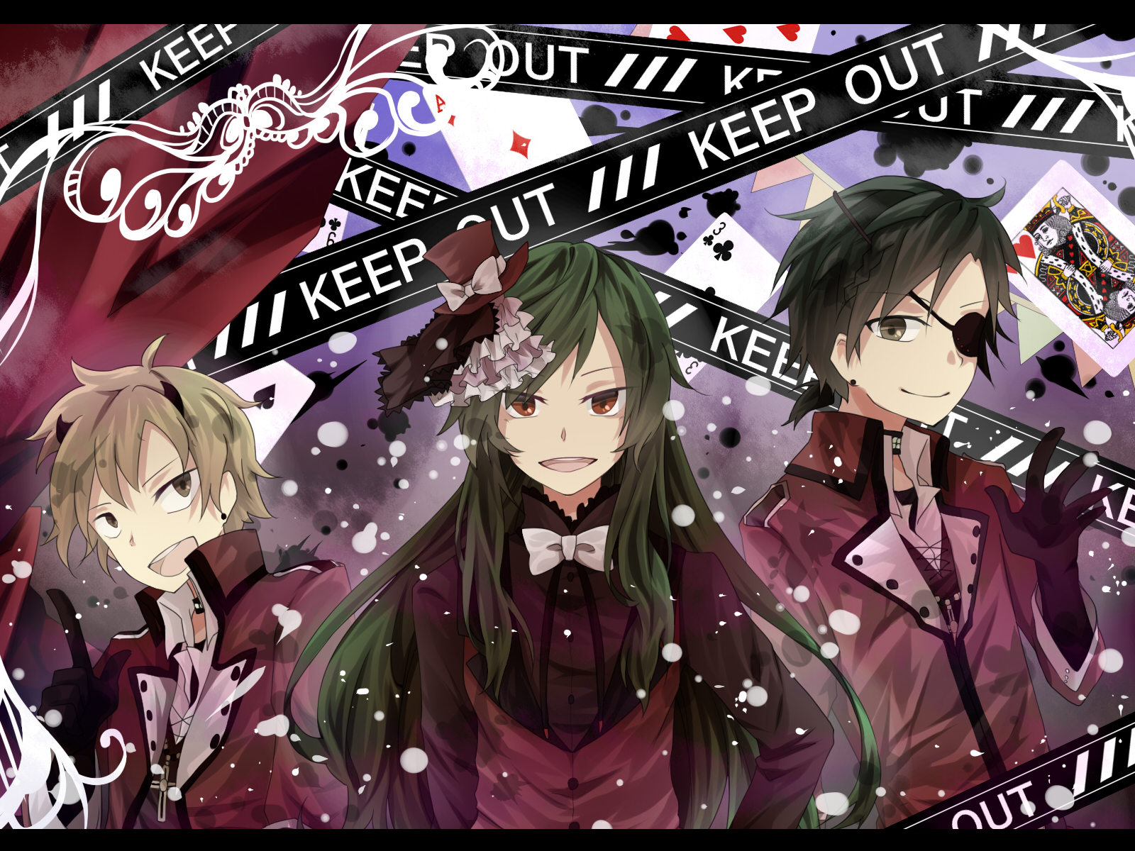 Description: A couple of anime characters standing next to each other in the snow with signs above them that say keep it i'm keep out.
