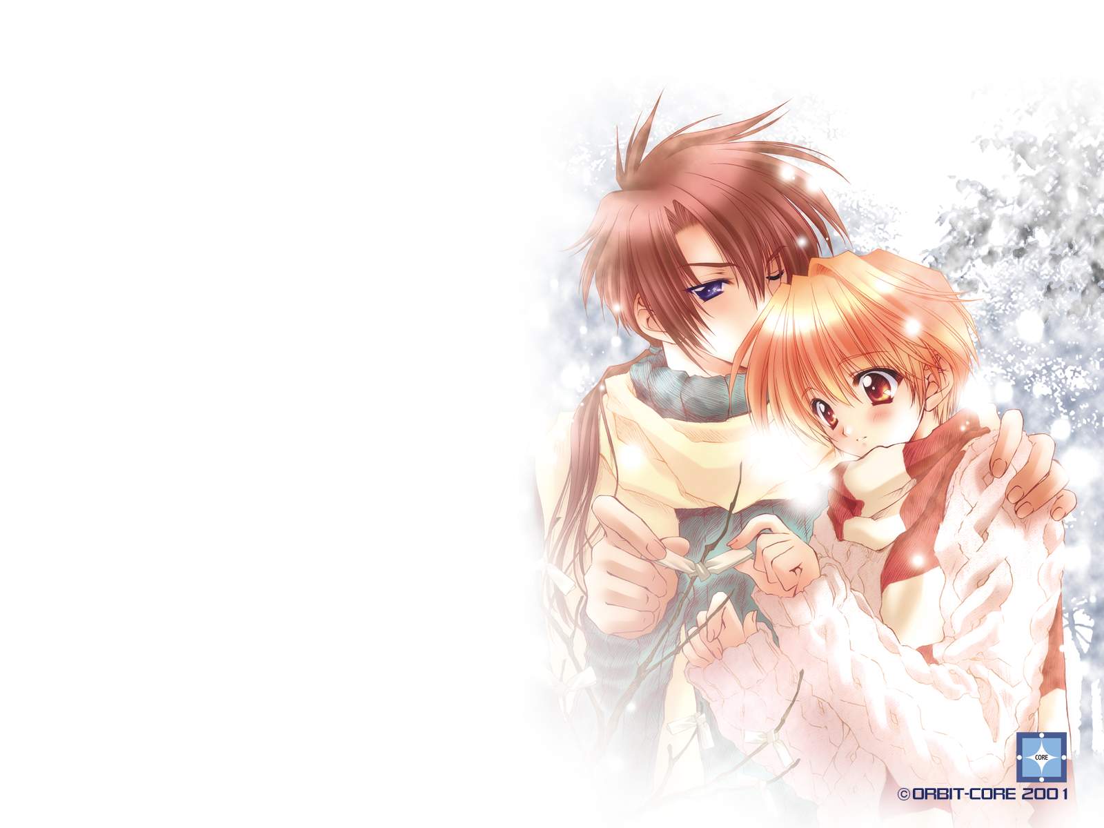 Description: A couple of anime characters standing next to each other in front of a white background with snowflakes.
