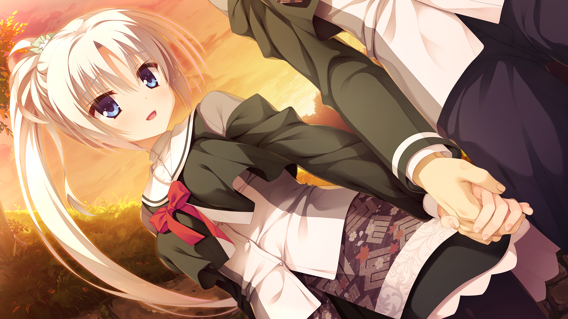 Description: A couple of anime characters standing next to each other in front of a sunset background with trees and bushes.