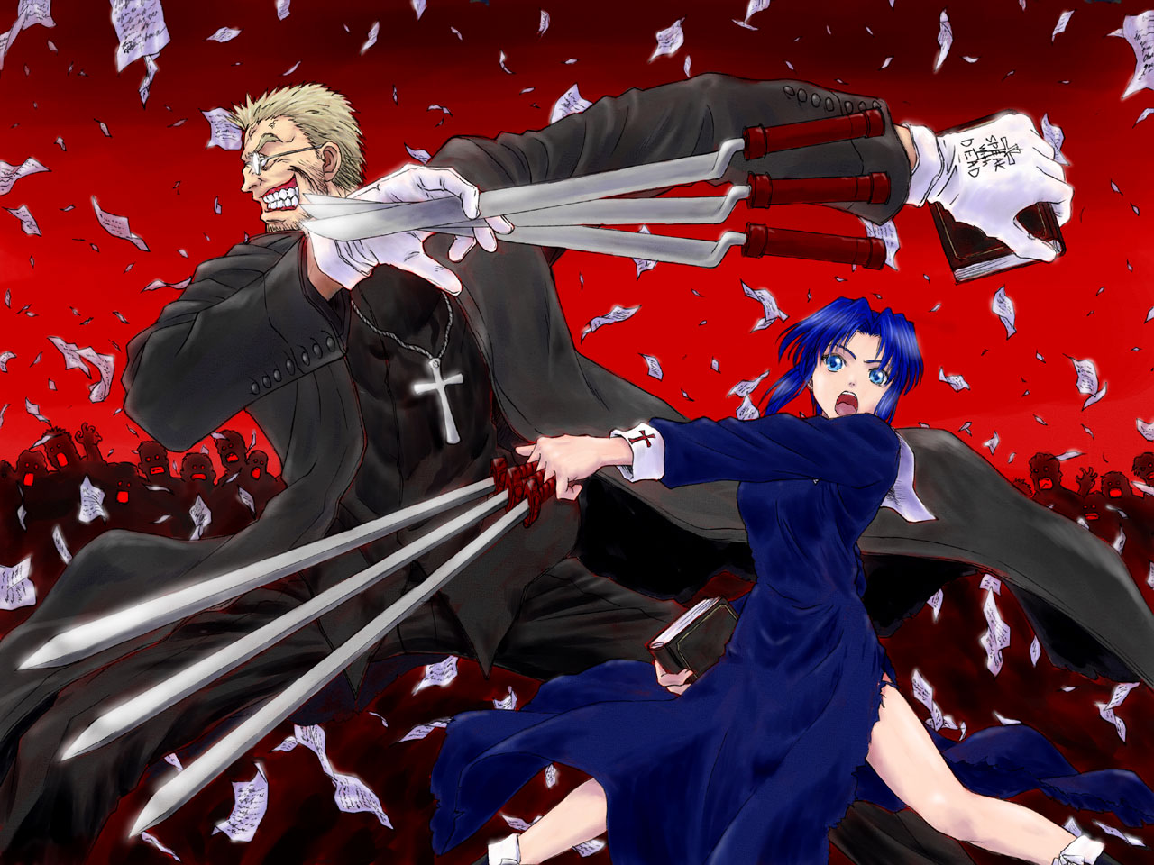 Description: A couple of anime characters fighting over a red background with a cross on it's chest and two swords in their hands.