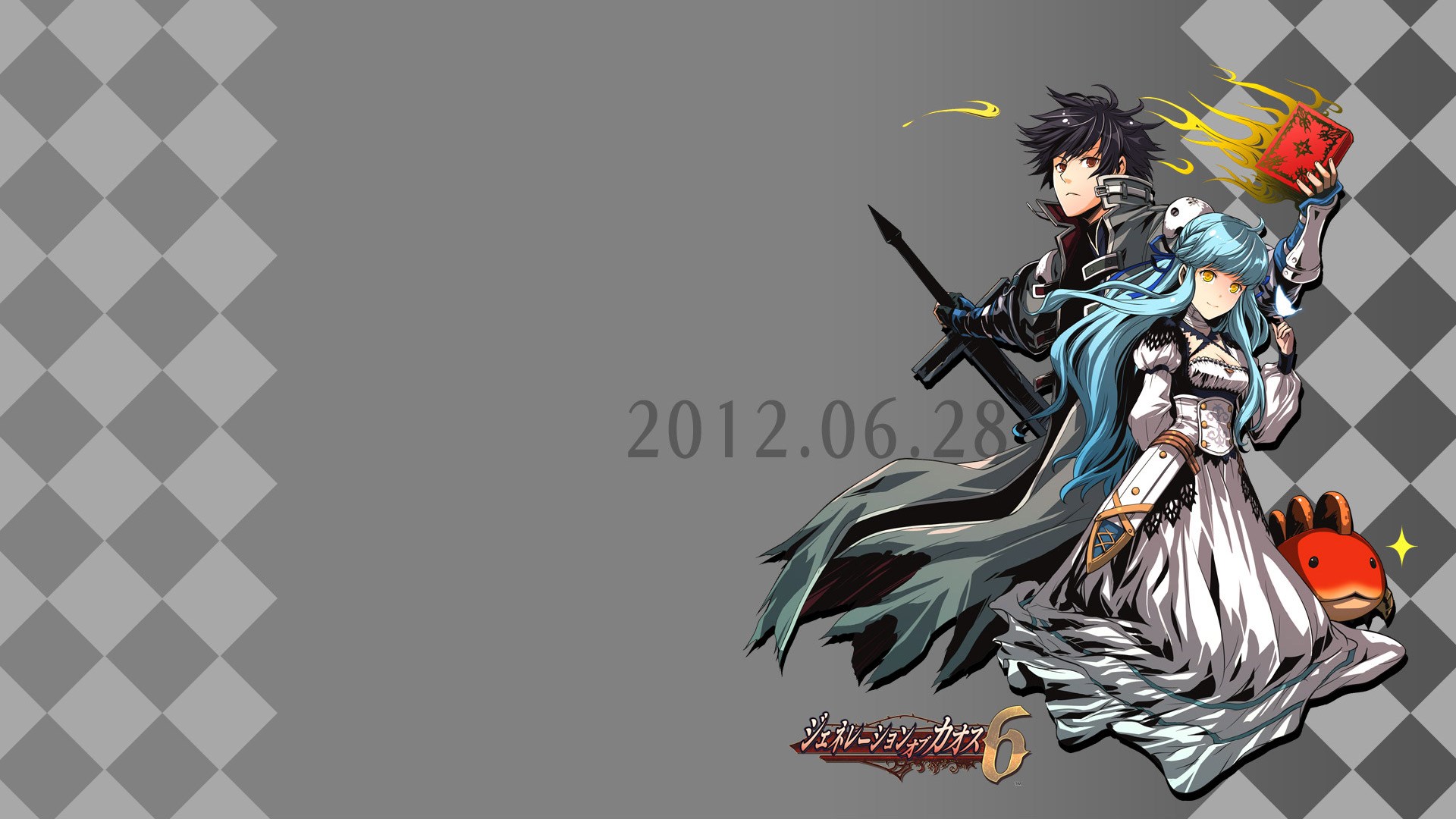 Description: A couple of anime characters holding swords and a red heart on a gray background with a checkered pattern.