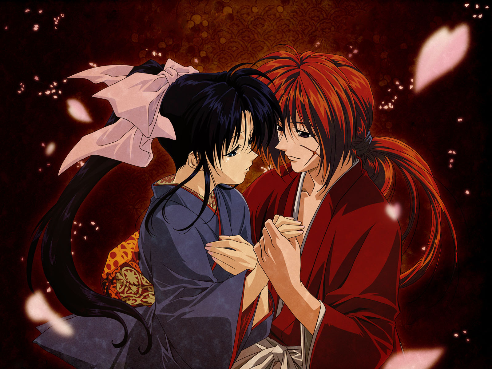 Description: A couple of anime characters standing next to each other with an umbrella over their heads and a dragon in the background.