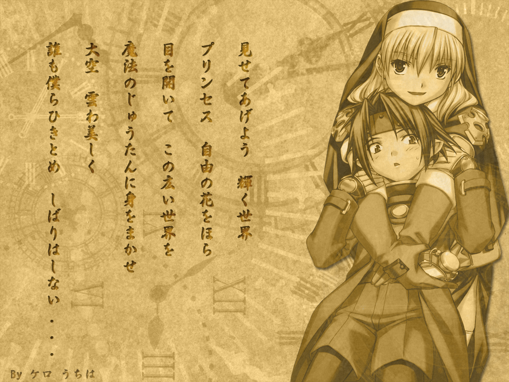 Description: A couple of anime characters standing next to each other on a wall with asian writing on it and a clock in the background.
