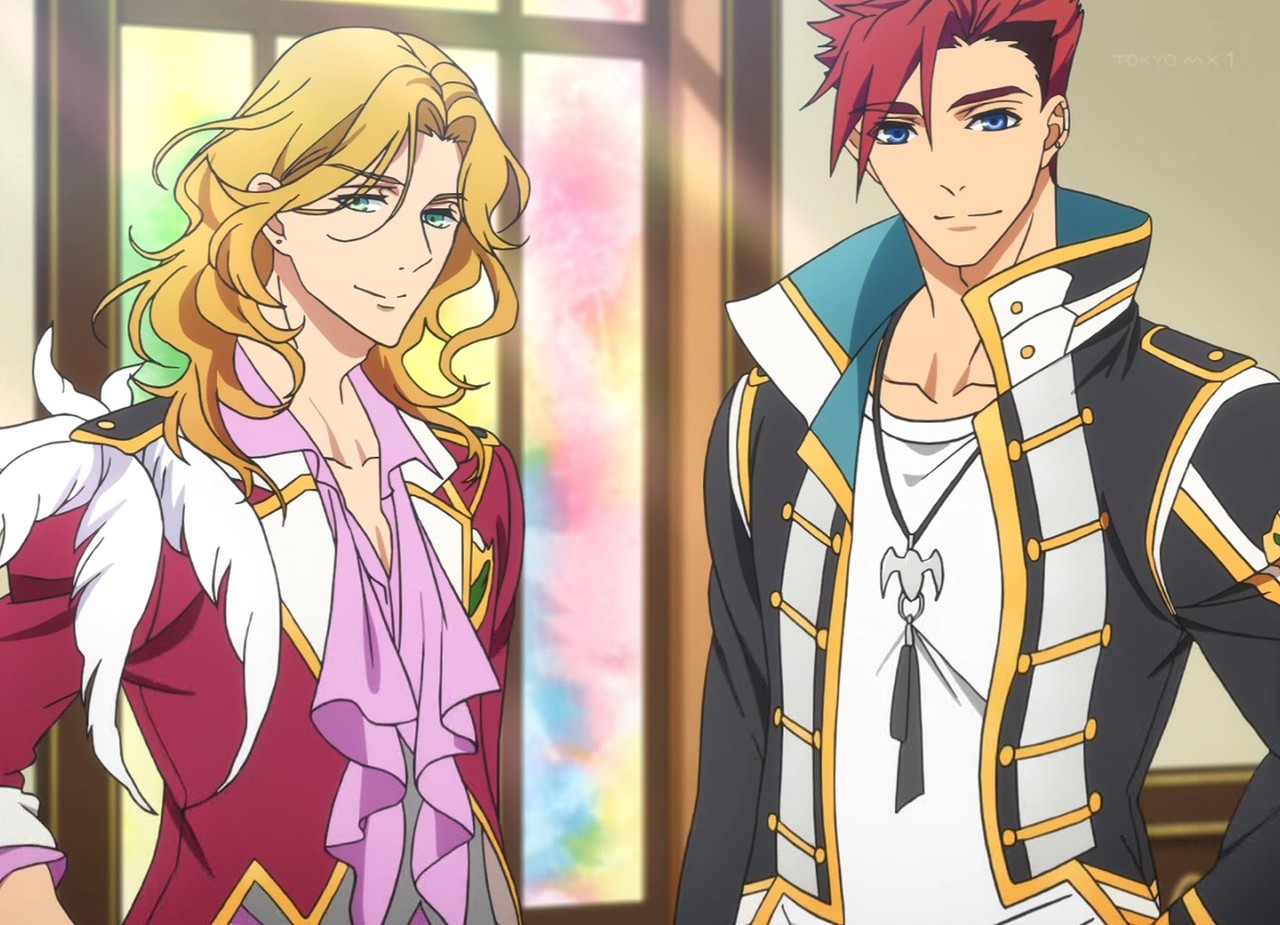 Description: A couple of anime characters standing next to each other in front of a window with a colorful background behind them.