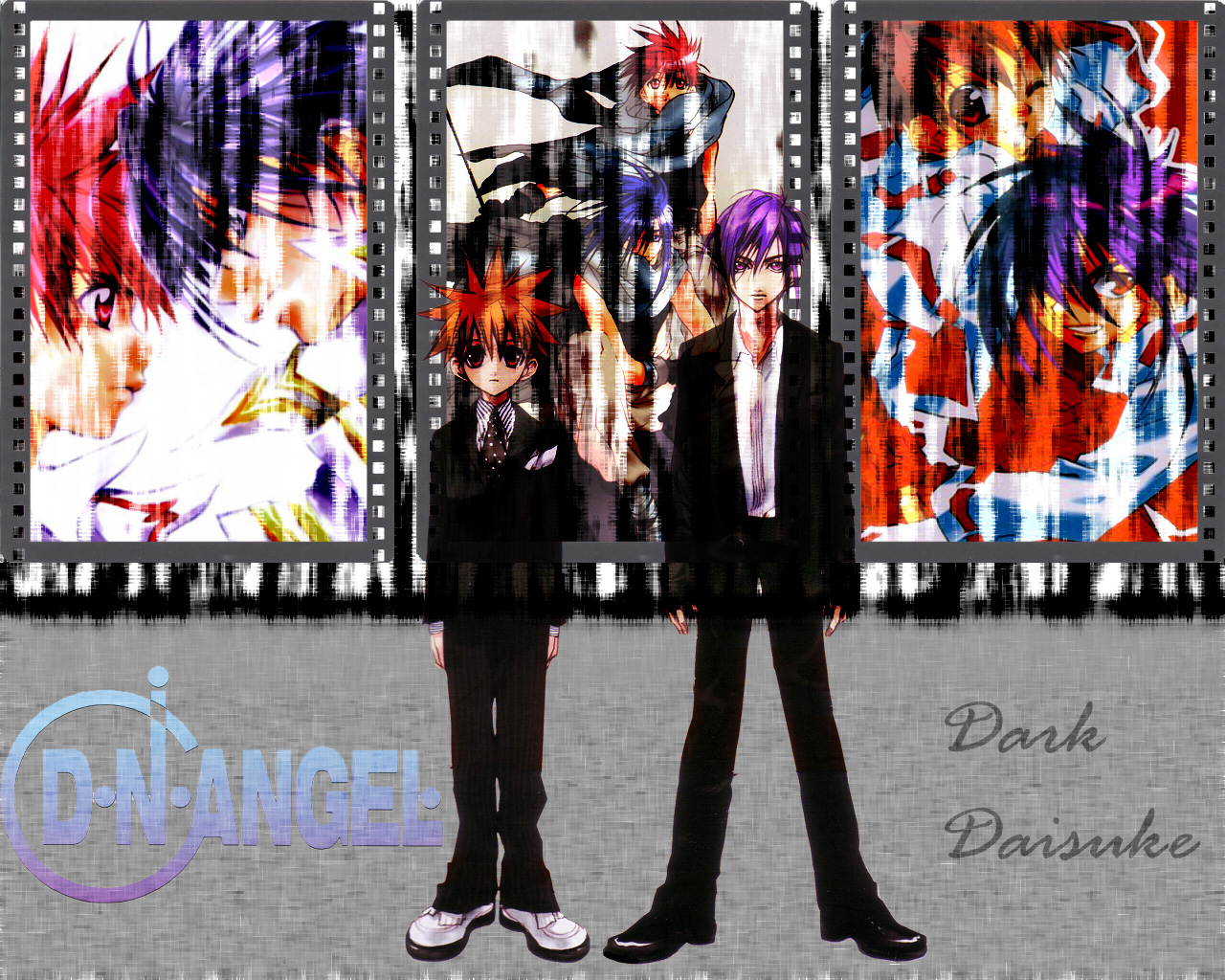 Description: Two people standing in front of a picture of anime characters on a film strip with the words on - dance.