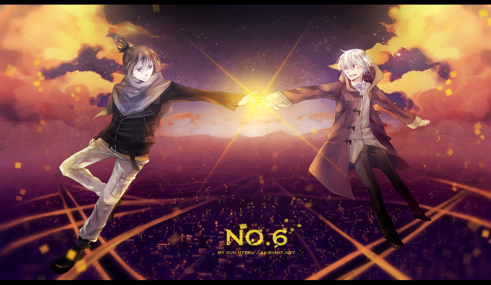 Description: Two anime characters are dancing in front of a sky background with clouds and a yellow light in the middle.