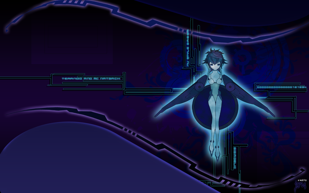 Description: A anime girl with a blue dress and a black background with a blue swirl and a blue background with a blue swirl and a blue swirl.