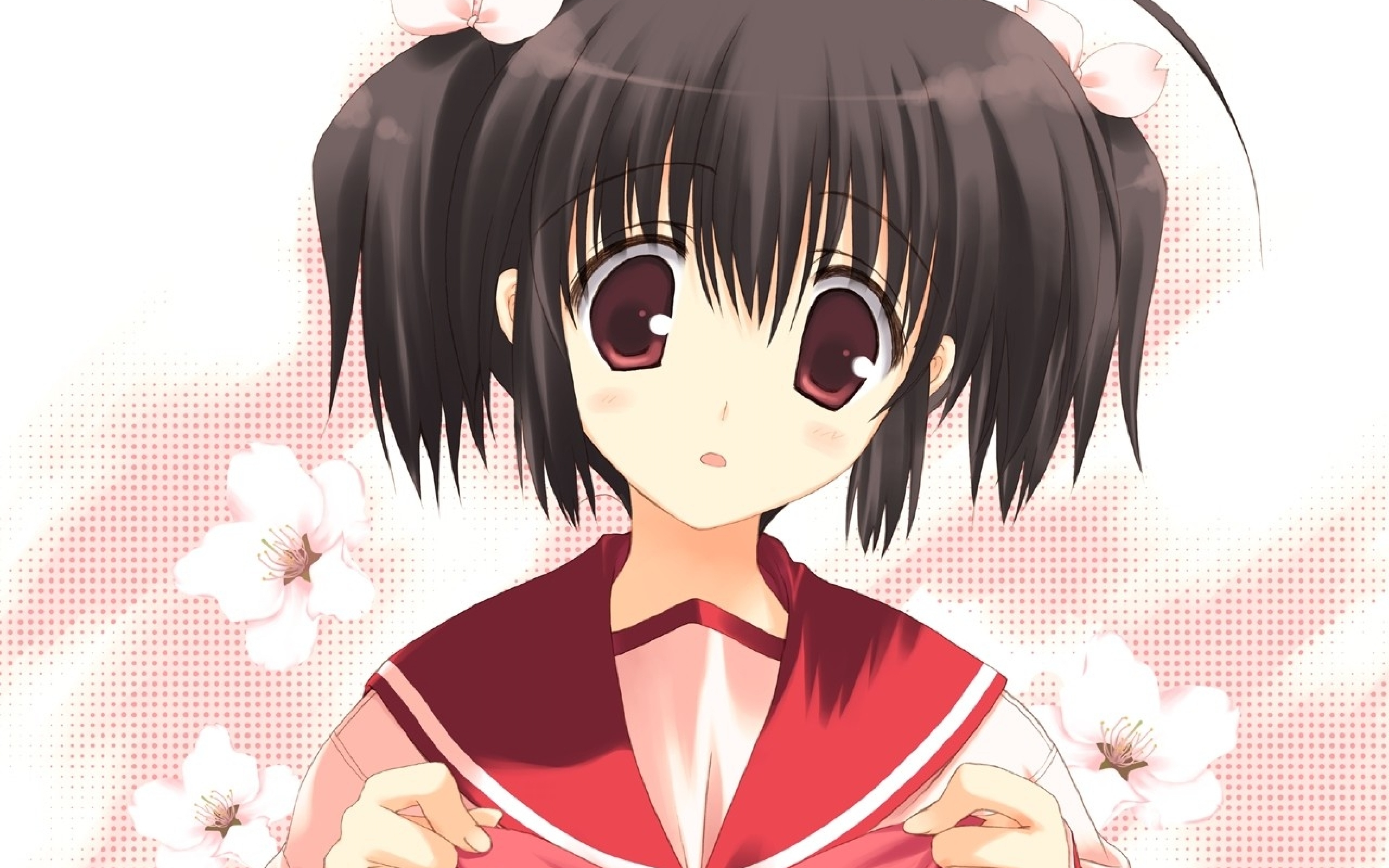 Description: A anime girl with black hair and big eyes wearing a red and white outfit and holding a white flower.