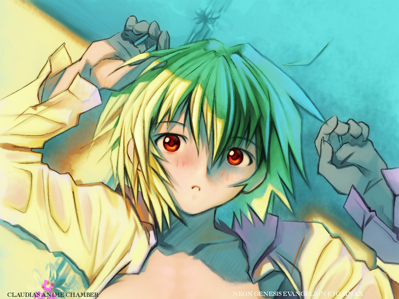 Description: A anime girl with green hair and red eyes posing for a picture with her arms behind her head and a blue background.