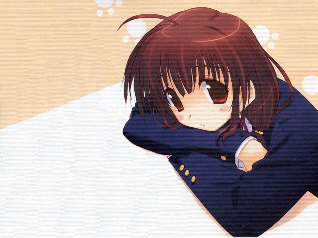 Description: A anime girl with long hair and a blue jacket is leaning on a wall with bubbles in the background.